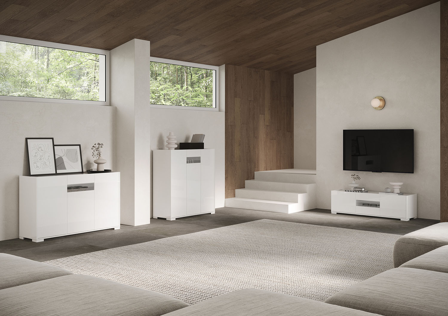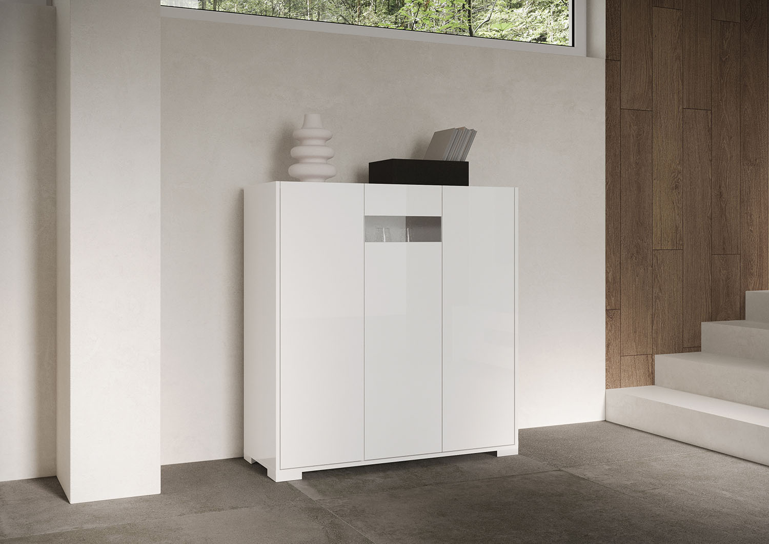 The Riflesso tall sideboard with three doors, equipped with two large internal compartments with shelves, is the perfect solution to keep everything in order and always within reach. The central door features a smoked tempered glass insert.