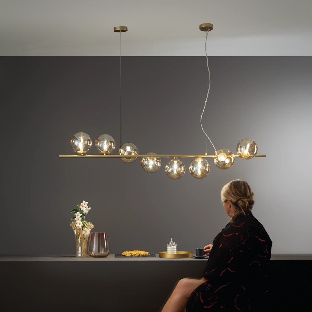 The Honey gold 8xG9 pendant light is a chandelier with an elegant and dramatic design, perfect for enhancing spaces with a modern and refined style. The gold- finished structure adds brightness and character to spaces, becoming a true decorative element.