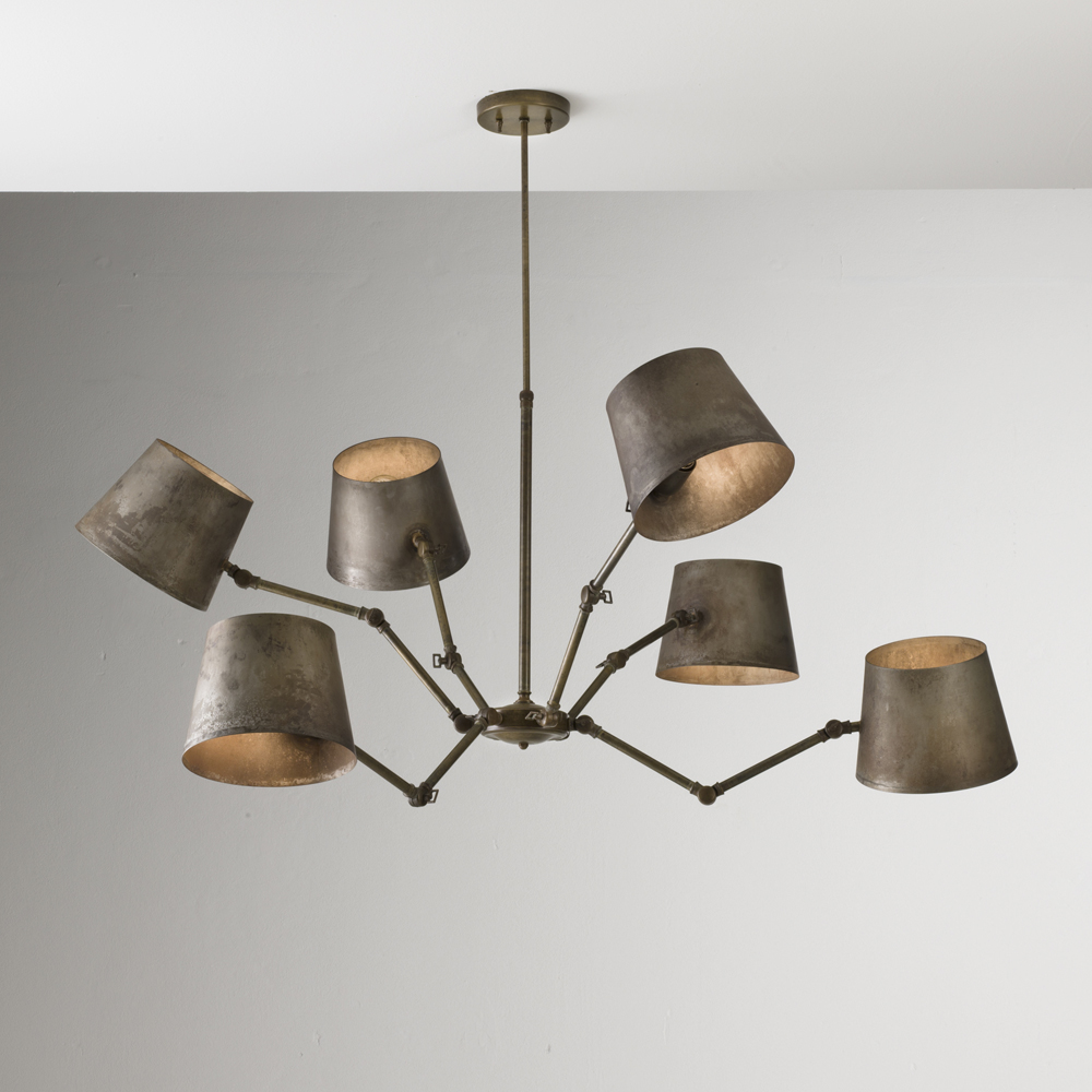 Classic elements and industrial references come together in a collection consisting of suspensions, wall lights, a table lamp and a floor lamp, available in the iron finish with cast brass joints.