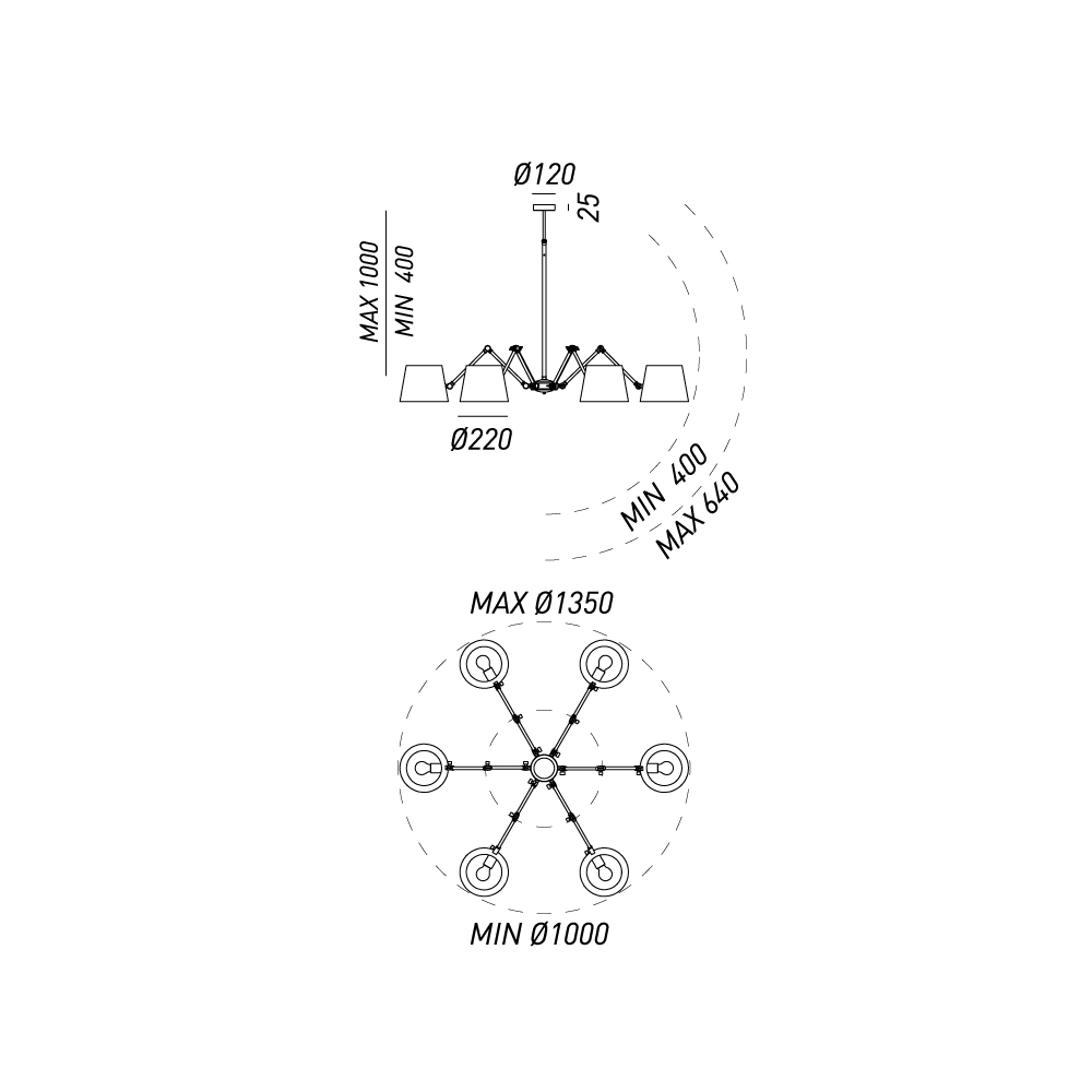 Diffuser: Ø220 mm; h.max suspension 1000 mm; overall dimensions 1350mm; Rosette Ø120 mm
