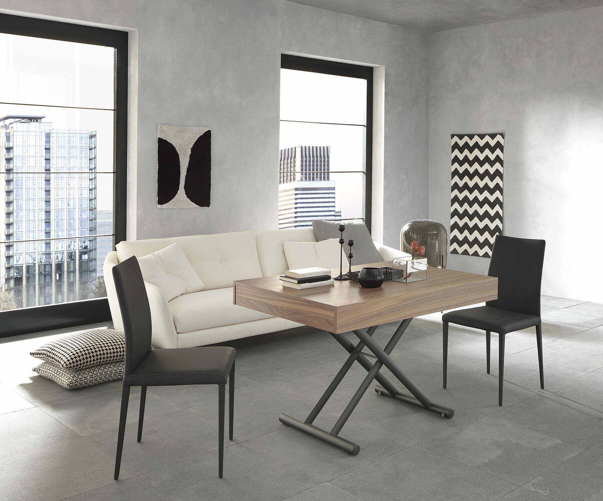 Coffee table convertible into a dining table, metal base, gas mechanism, height adjustable to the millimetre from 28 cm to 80 cm, rectangular top in melamine, lacquered, wood or mortar effect.
