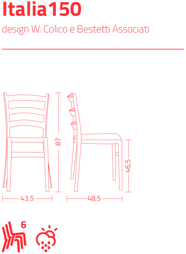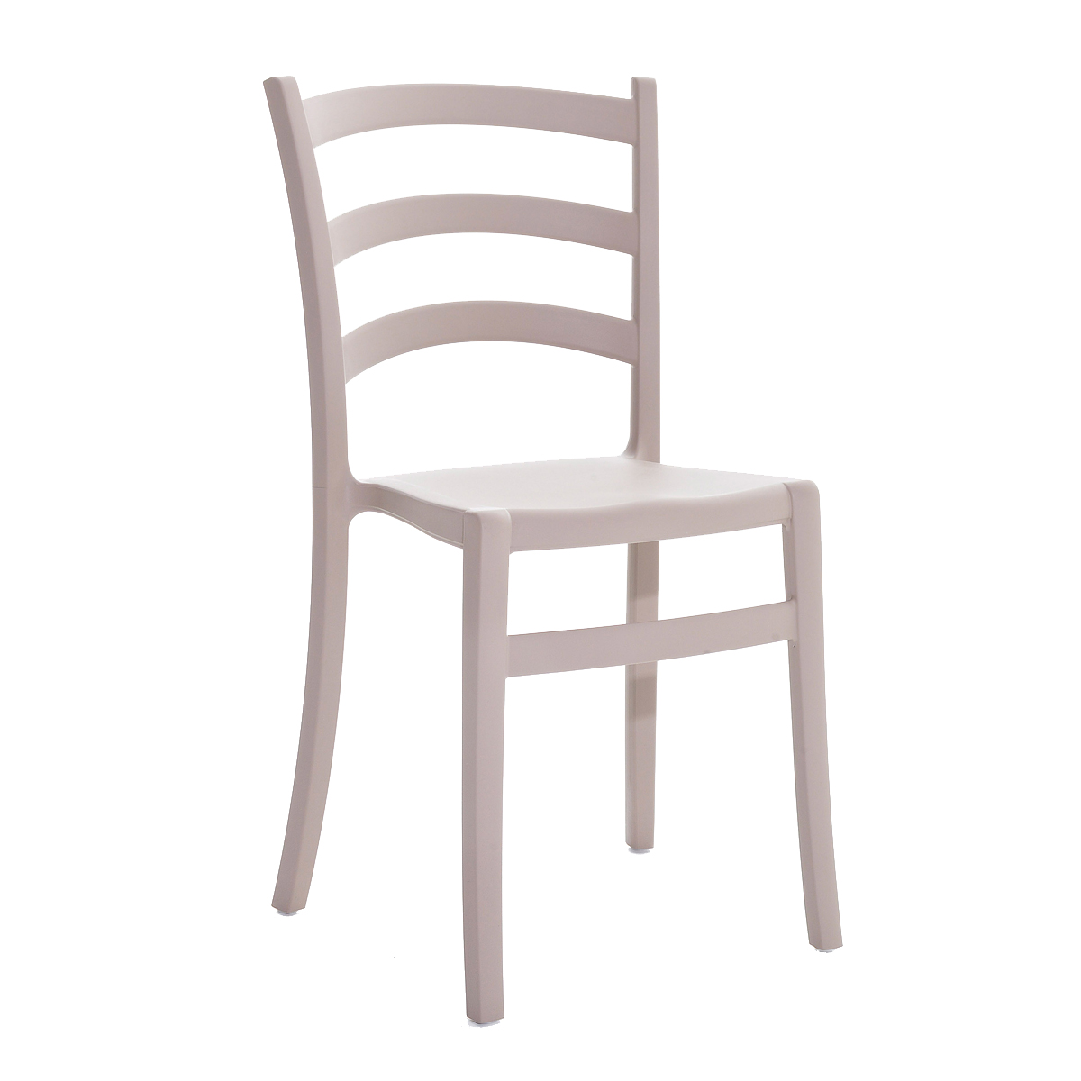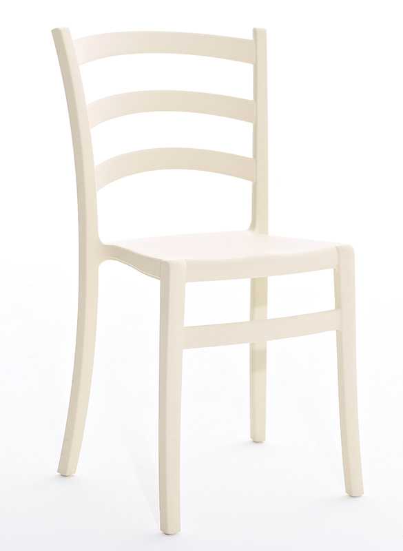 Stackable chair in soft touch polypropylene, recyclable and suitable for outdoor use.