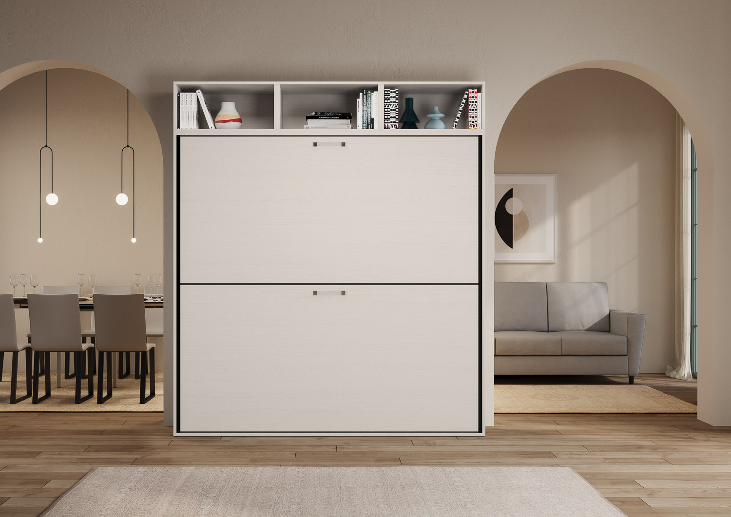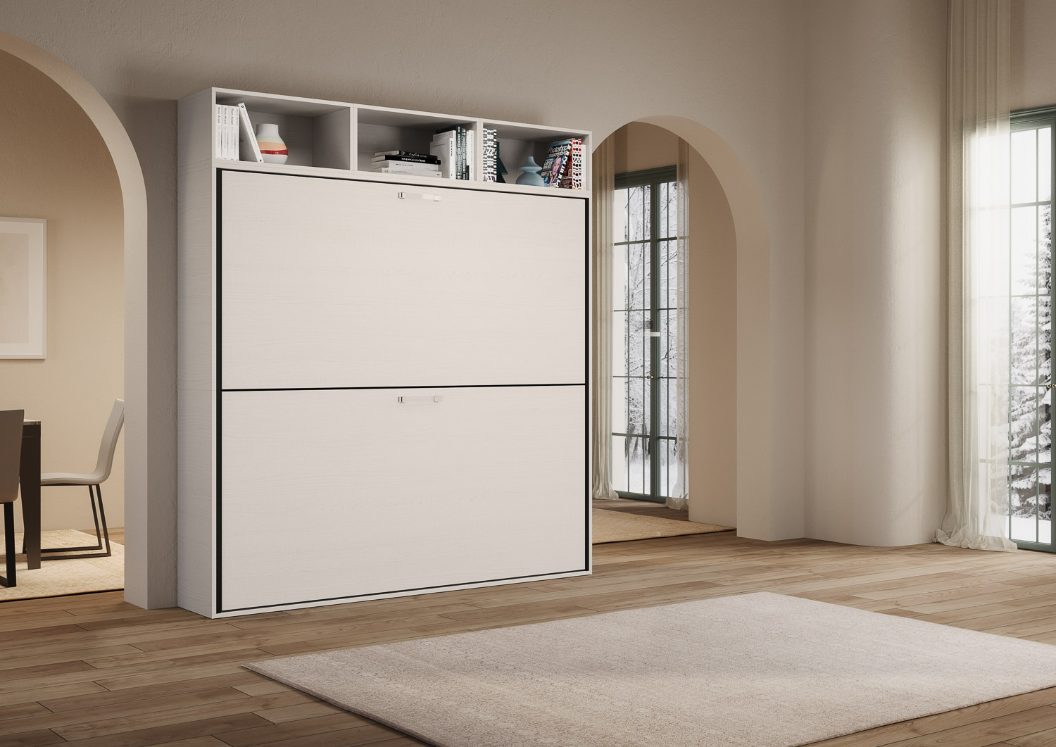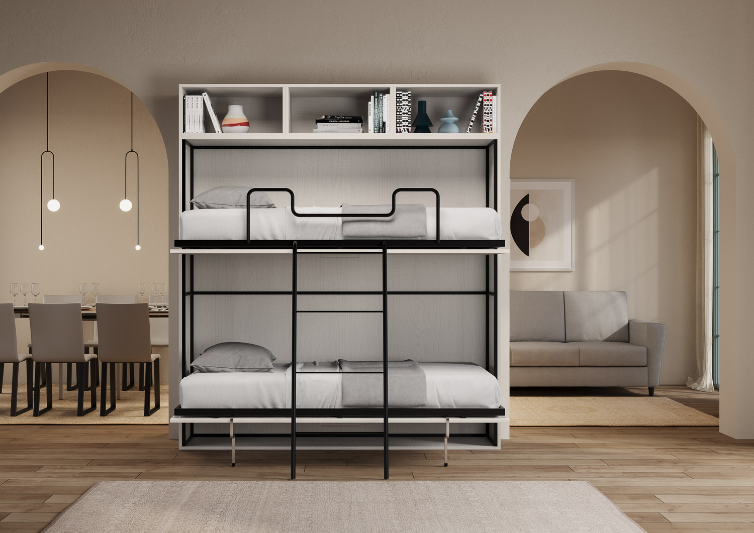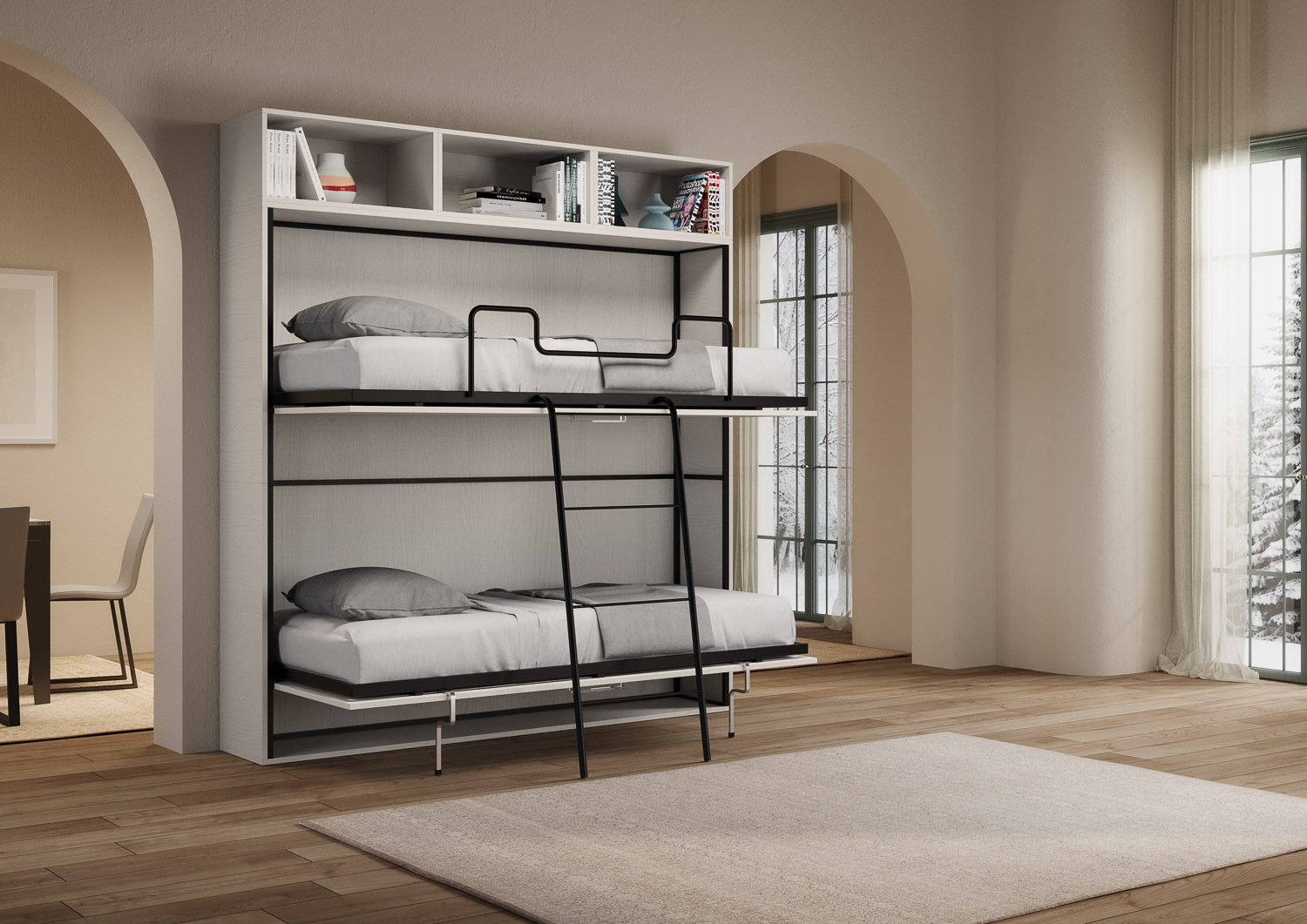 | Material | Kando L Single 2x Foldaway bunk Bed proposed in combination with three wall units with open compartment. A modern and space saving foldaway bed, available in the bunk bed version with two single foldaway beds and cabinets. Practical and multifunctional, w |