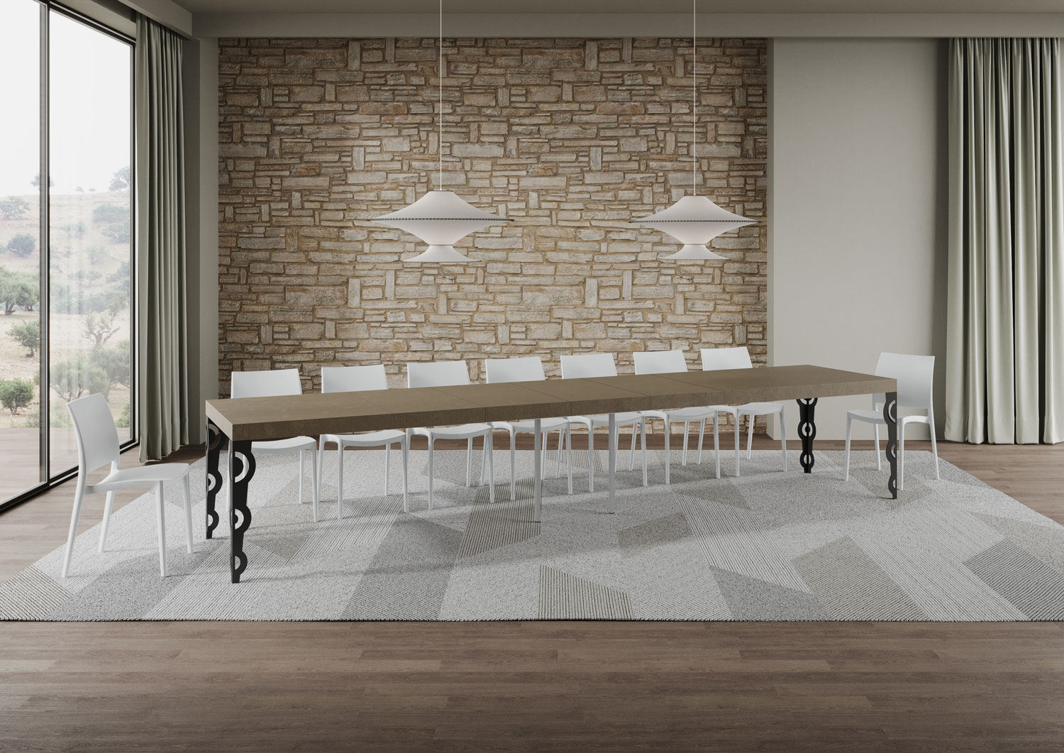 The extendable table Karamay Premium can extend progressively up to 420 cm, and is able to accommodate up to 18 people.