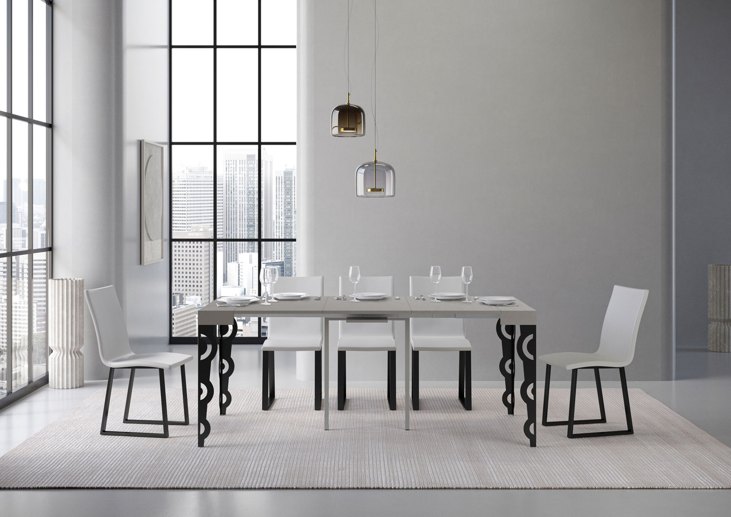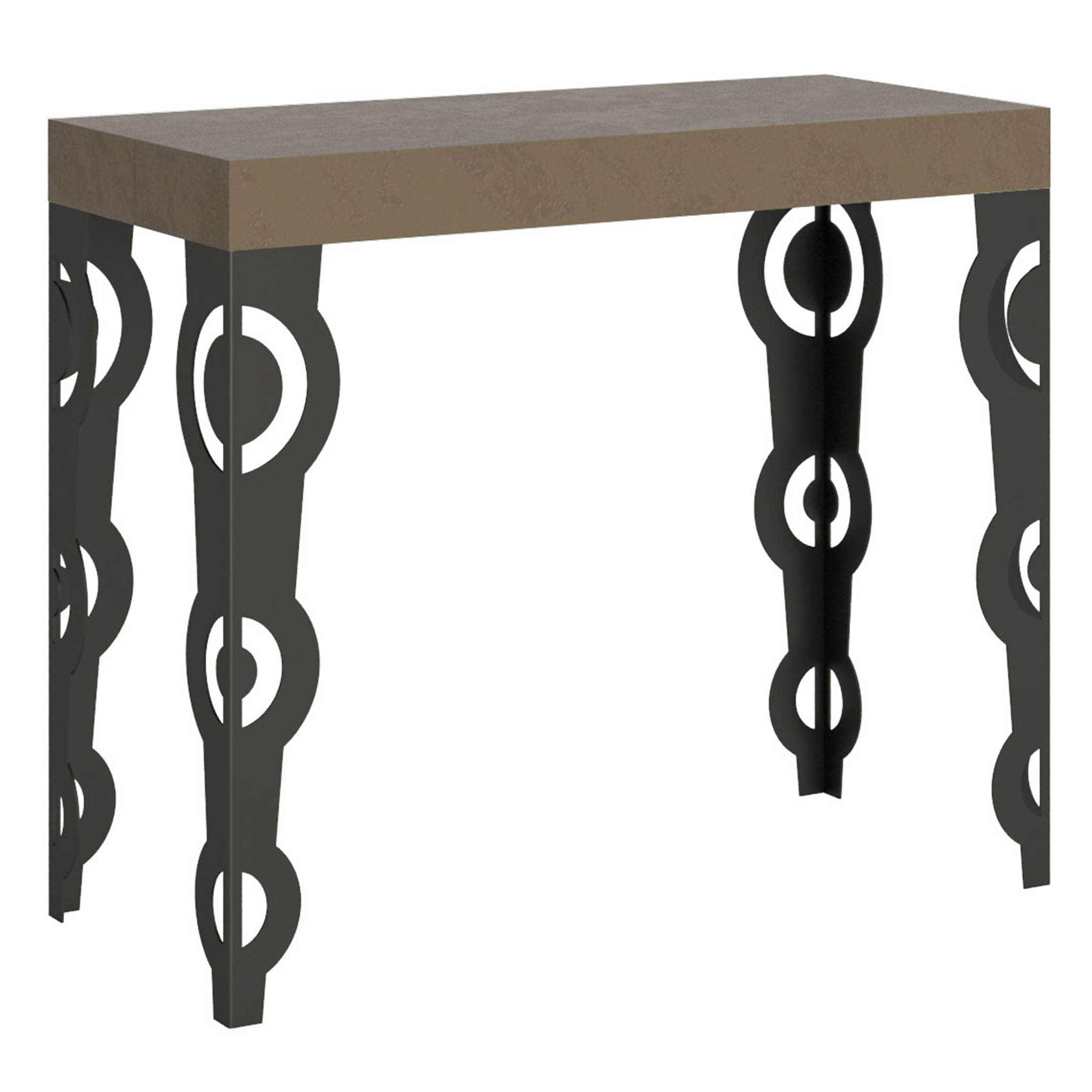 Extending console table Karamay Small, versatile and robust, a perfect furnishing solution ideal for any environment: entrance, kitchen, dining room, living room or hallway. The extending console table Karamay Small can be turned effortlessly into a large dining table that can be extended up to 196 cm that can accommodate up to 10 people. Made of melamine boards and iron legs. The extending mechanism with telescopic aluminium rails and the provided central support system make the console table steady and sturdy. When the console table is collapsed, the extension leaves have to be stored elsewhere. Itamoby product Made in Italy Sizes: Closed console table: L.90 D.40 H.77 cm Length with 1 leaf: 92 cm Length with 2 leaves: 144 cm Length with 3 leaves:: 196 cm