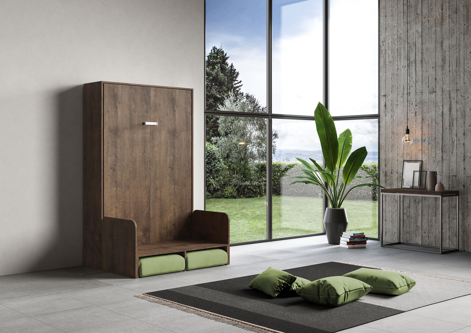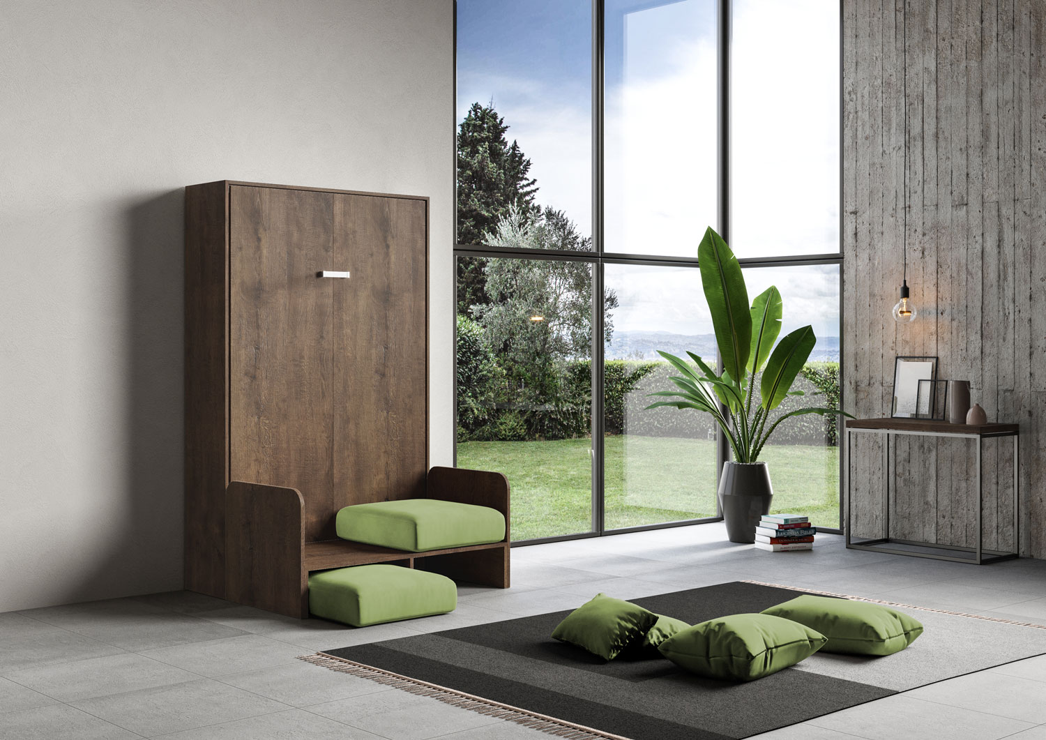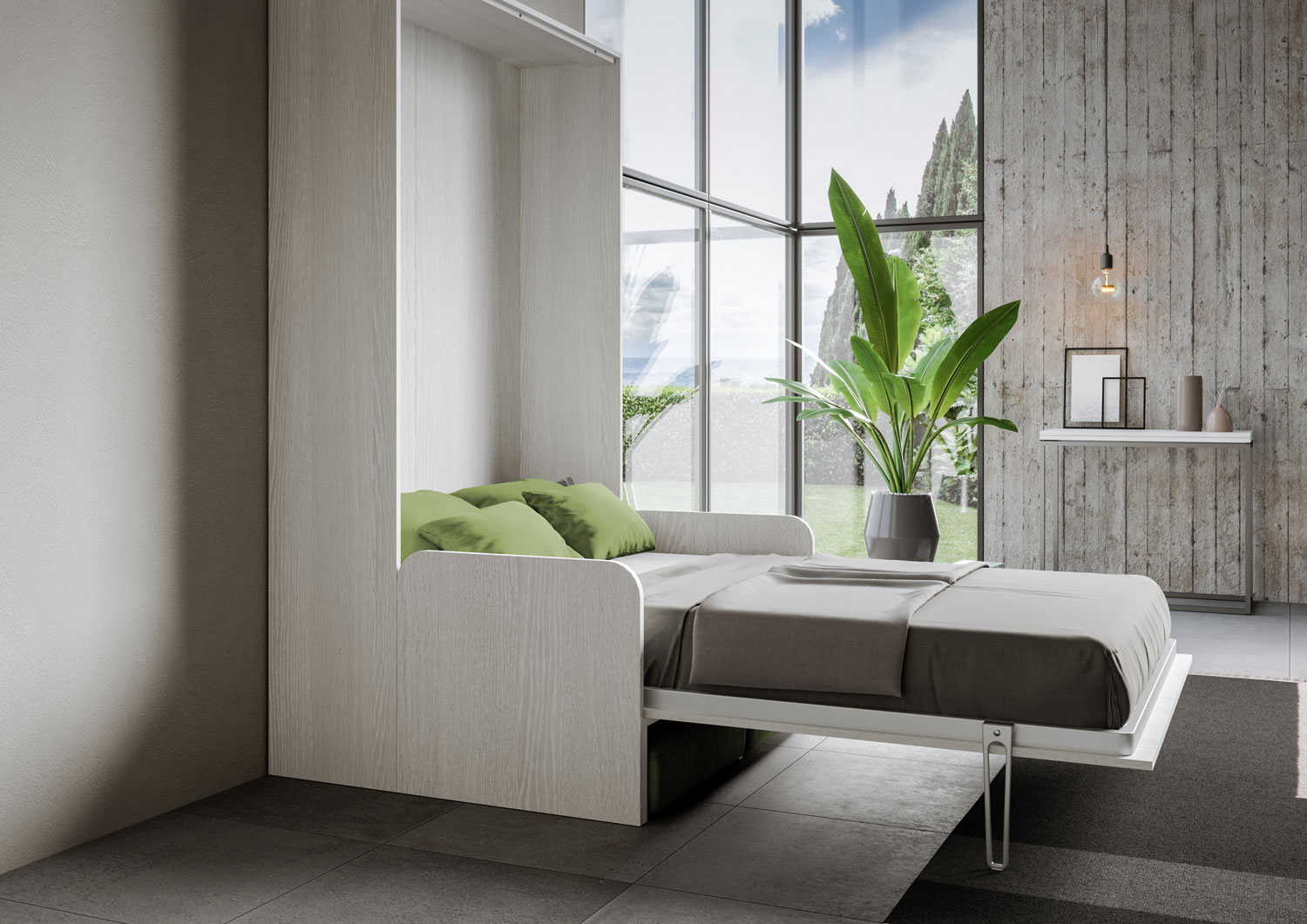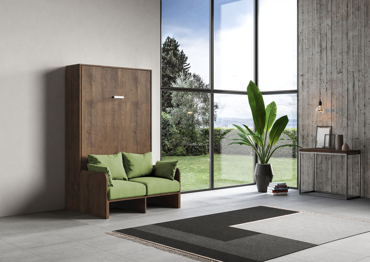 Material Kentaro Sofà Foldaway French size Bed. Vertical foldaway French size bed with sofa wooden structure and six microfiber cushions. The cushions are customizable in colour. Perfect for turning in just a few moves a living area into a sleeping area, simply by
