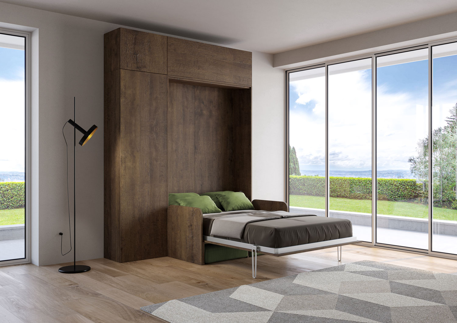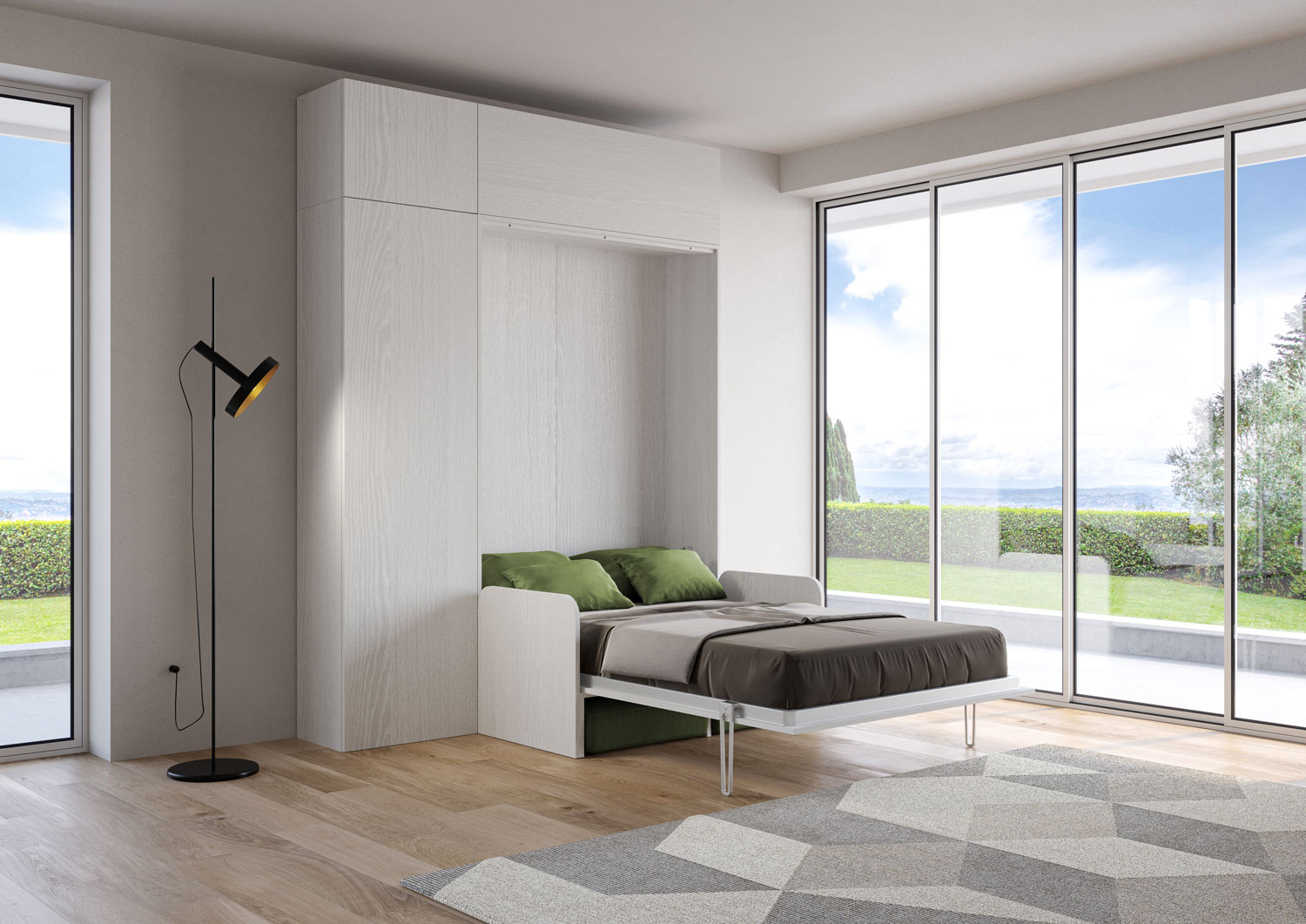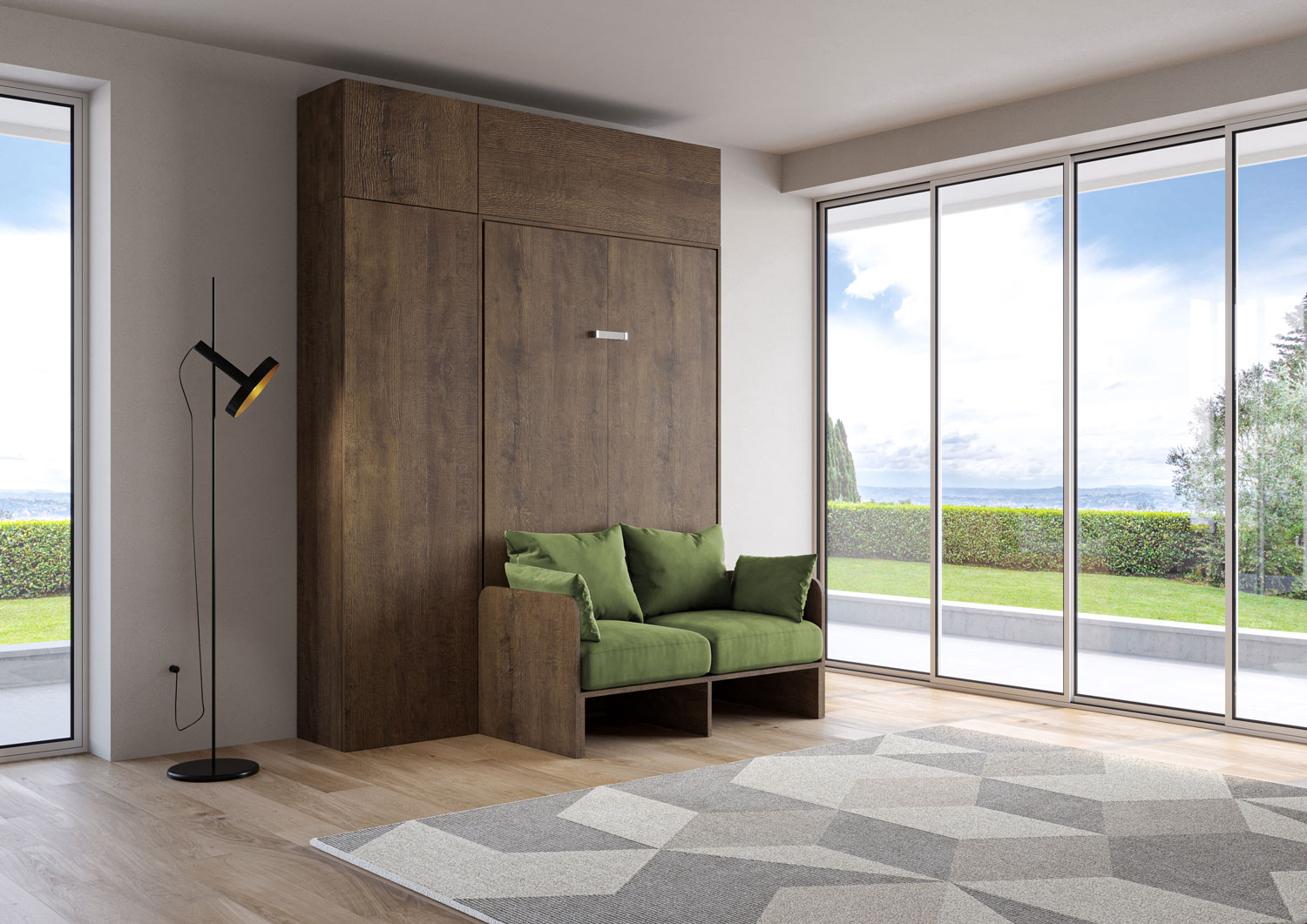 Material Vertical Foldaway French size Bed with sofa and Isoka column cabinet and 2 Isoka upper wall units. Composition including the Kentaro vertical foldaway French size bed with sofa with cushions and pillows, together with one Isoka column cabinet and two Isok