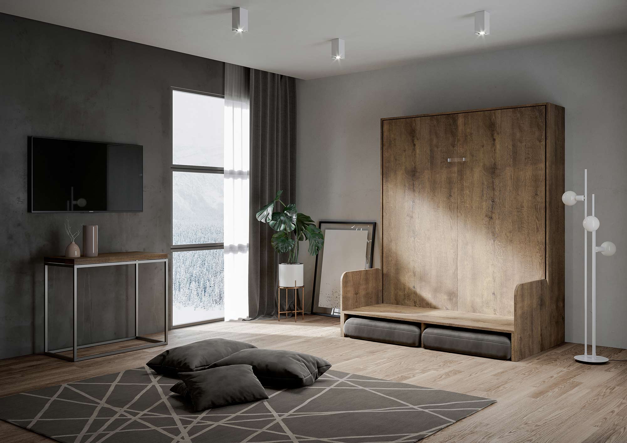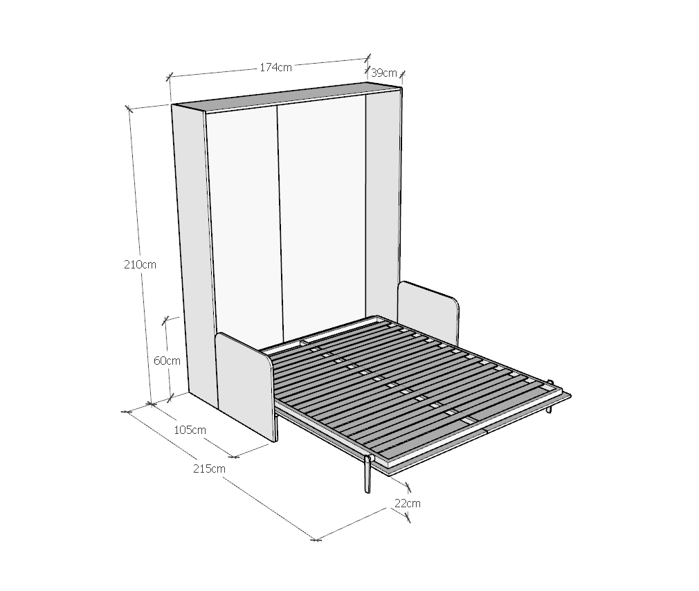 The Kentaro Sofà 160 double wall bed is an original idea that, thanks to the addition of a sofa, transforms the living area into a sleeping area in just a few simple steps. A perfect solution for studios and small spaces where every square meter counts: this smart model allows you to optimize your space without sacrificing comfort, convenience, and design. The sofa cushions, with fully removable covers, are made of microfiber. The upholstery color can be chosen from those available in the image gallery. The bed and sofa frame is made of 18 mm thick melamine-faced particleboard. The base frame is made of reinforced iron, epoxy powder-coated in an embossed aluminum color. Includes a 163x190 cm beech slatted base with mattress straps. The bed is lowered by gas pistons and features a handle. Mattress not included. Recommended mattress dimensions: L. 160 W. 190 H. 22 cm. Maximum bed load: 240 kg. Please note: The Kentaro Sofà wall bed arrives disassembled. Assembly is highly difficult and requires two experienced people. Wall mounting is mandatory. Dimensions: Closed bed: L.173.6 D.105.2 H.210.5 cm. Open bed: L.173.6 D.215 H.210.5 cm. Height of base from floor: 22 cm. Maximum mattress height: 24 cm. Made in Italy. Product by Itamoby.