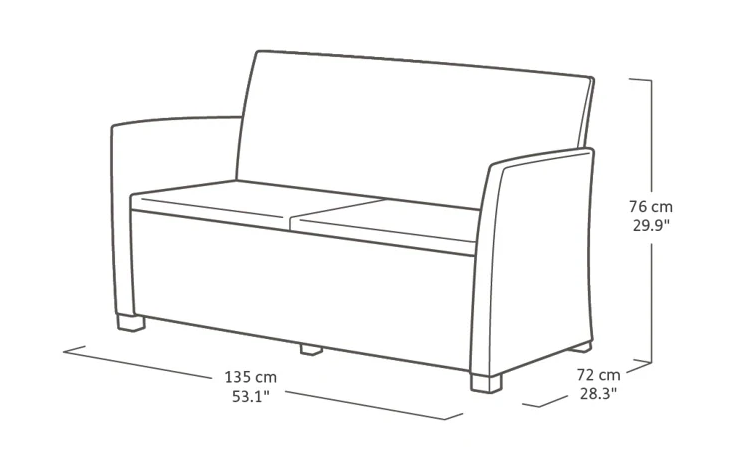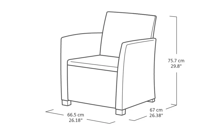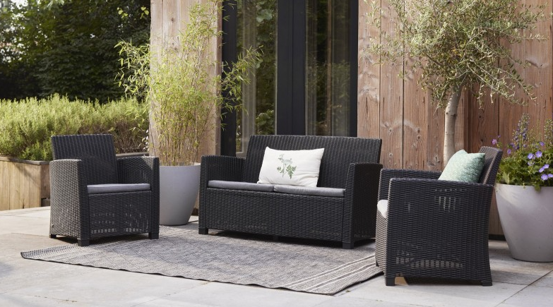 The Mia set by Keter is an outdoor lounge set consisting of a sofa, two armchairs and a storage table.