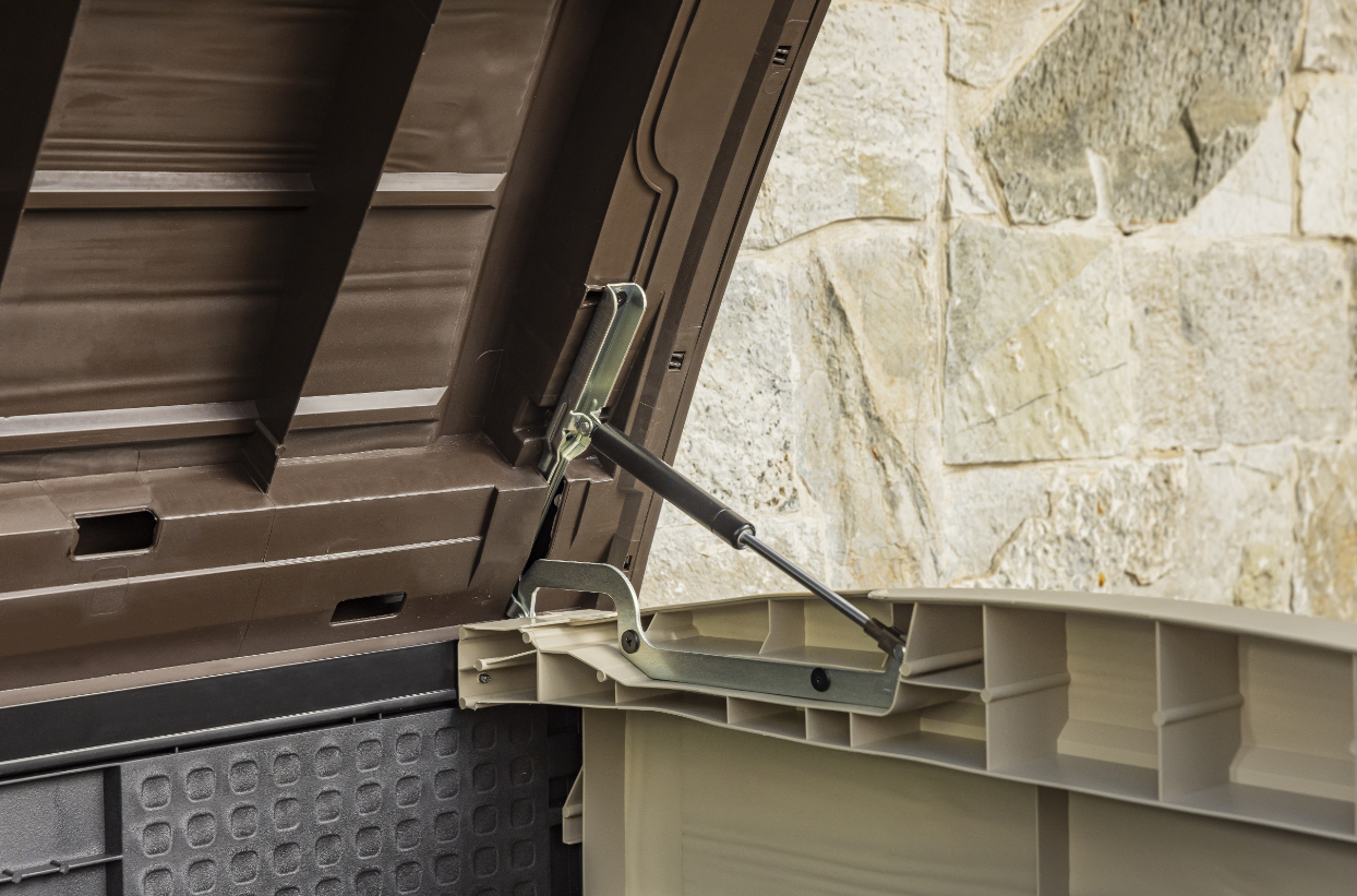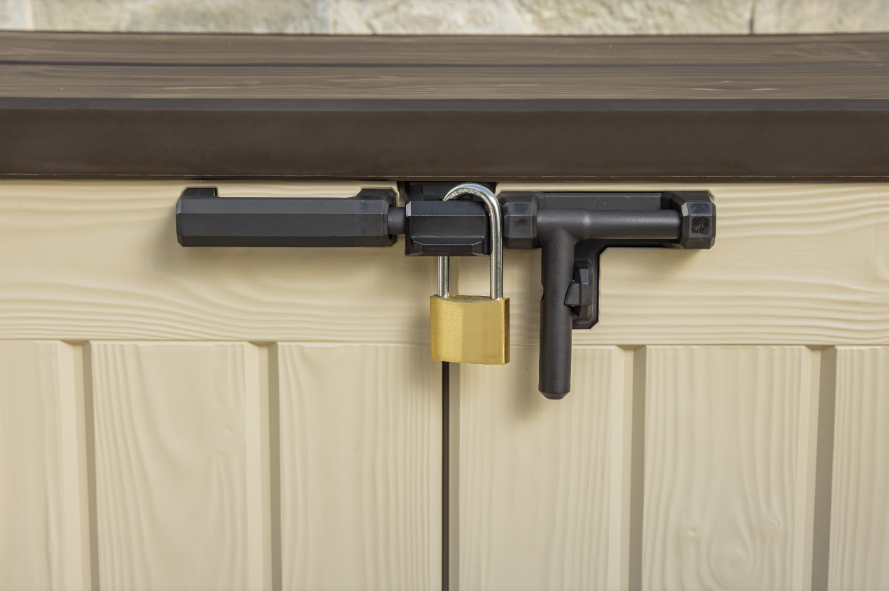 Thanks to its compact, wood-effect design, it easily adapts even to terraces or courtyards with limited space, offering generous capacity without excessive bulk.
