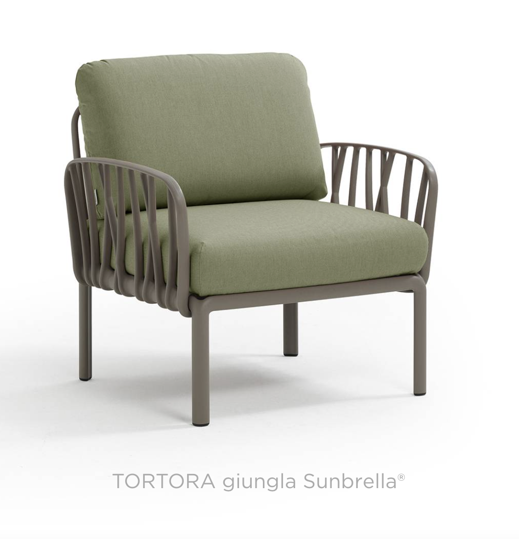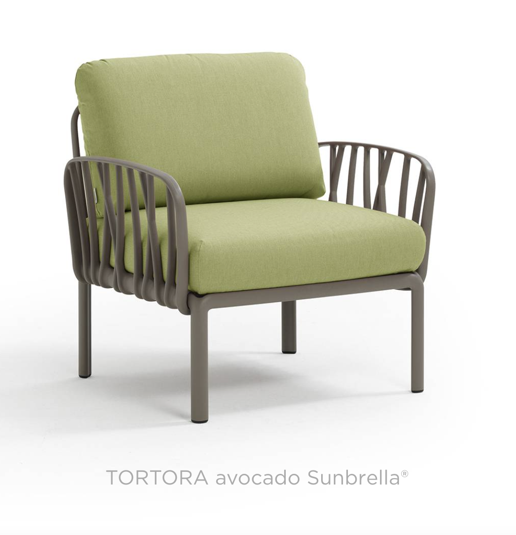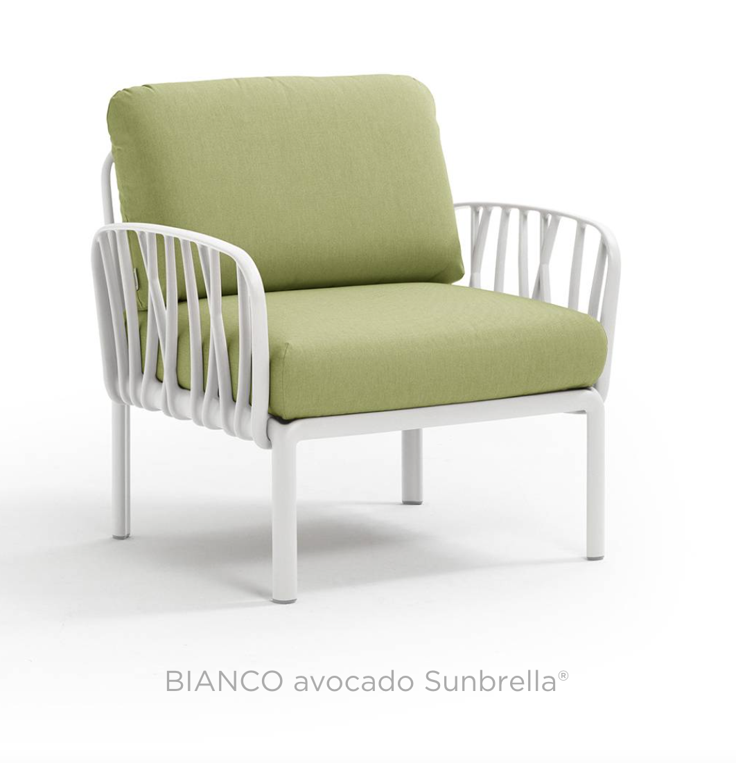 Relaxing armchair with fiberglass resin and padded armrests. It can be purchased individually or designed as a compositional element in larger sets from the Komodo modular seating collection.