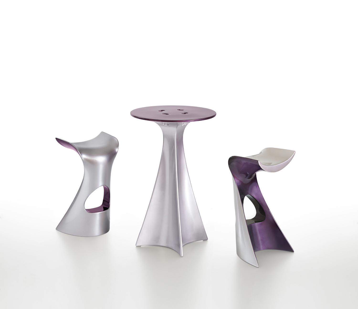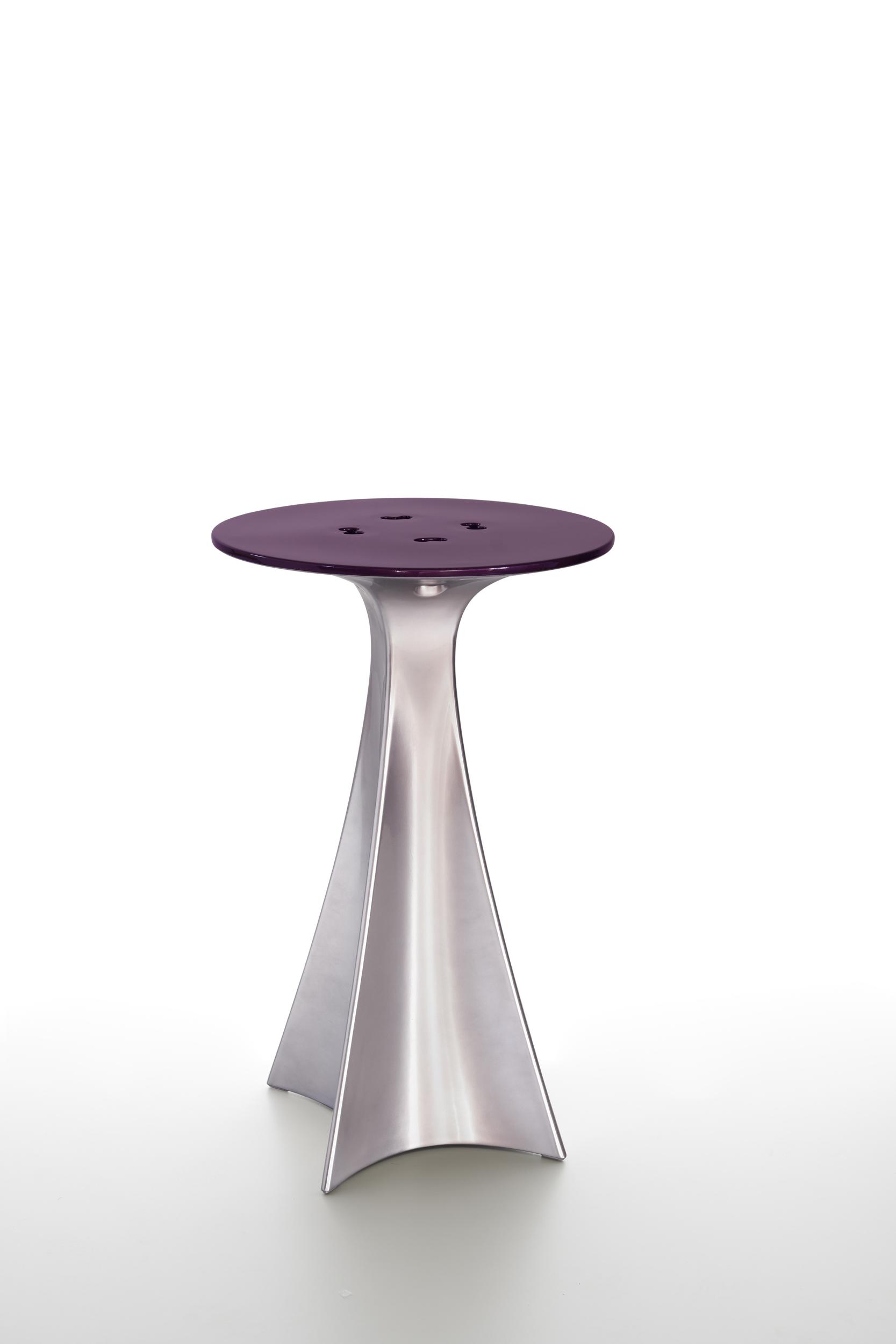 On the occasion of the tenth anniversary of the iconic Koncord stool designed by Karim Rashid, Slide expands the collection by adding its perfect partner, the Jet high table. Its curved base accentuates the silhouette of the stool until it merges with it, the top is decorated with symbols historically dear to the designer.