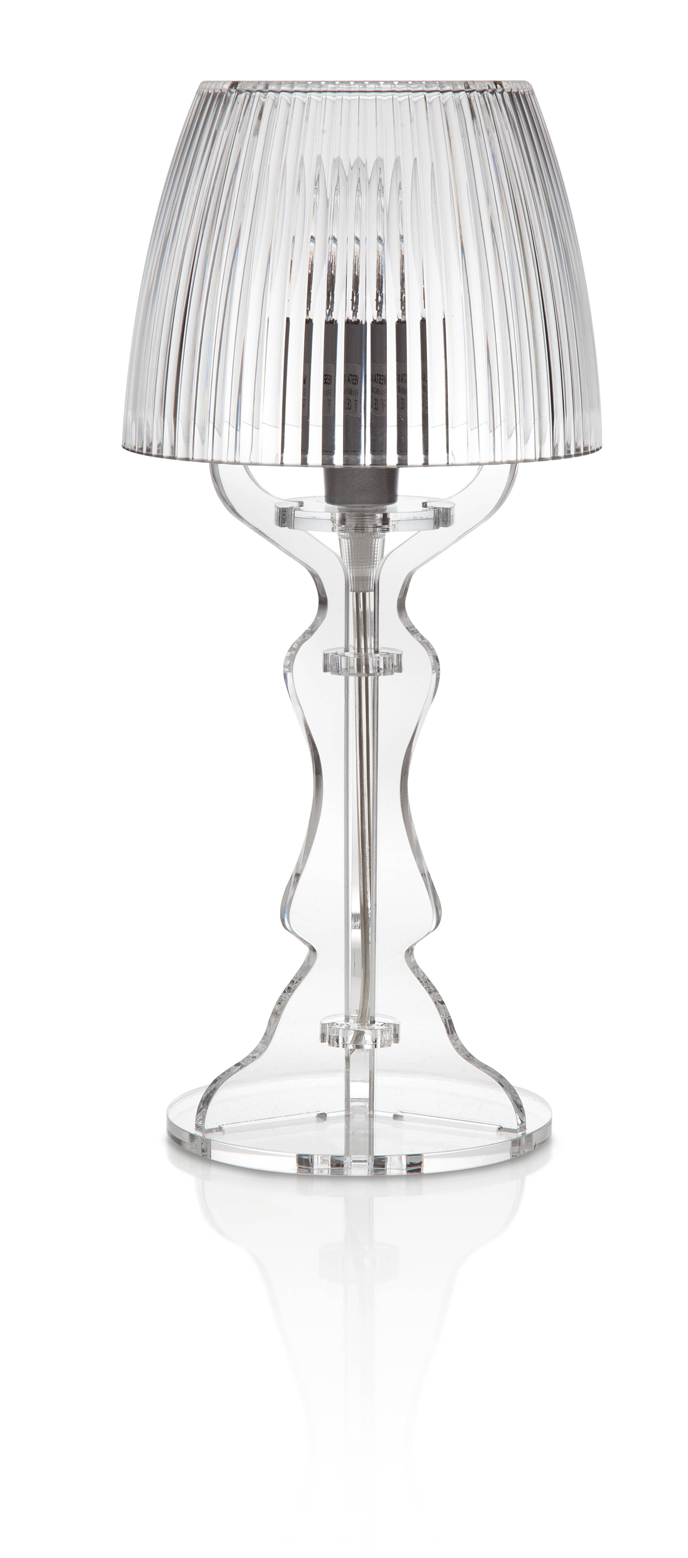 Table lamp in transparent acrylic crystal with prismatic cap, transparent lamp holder.