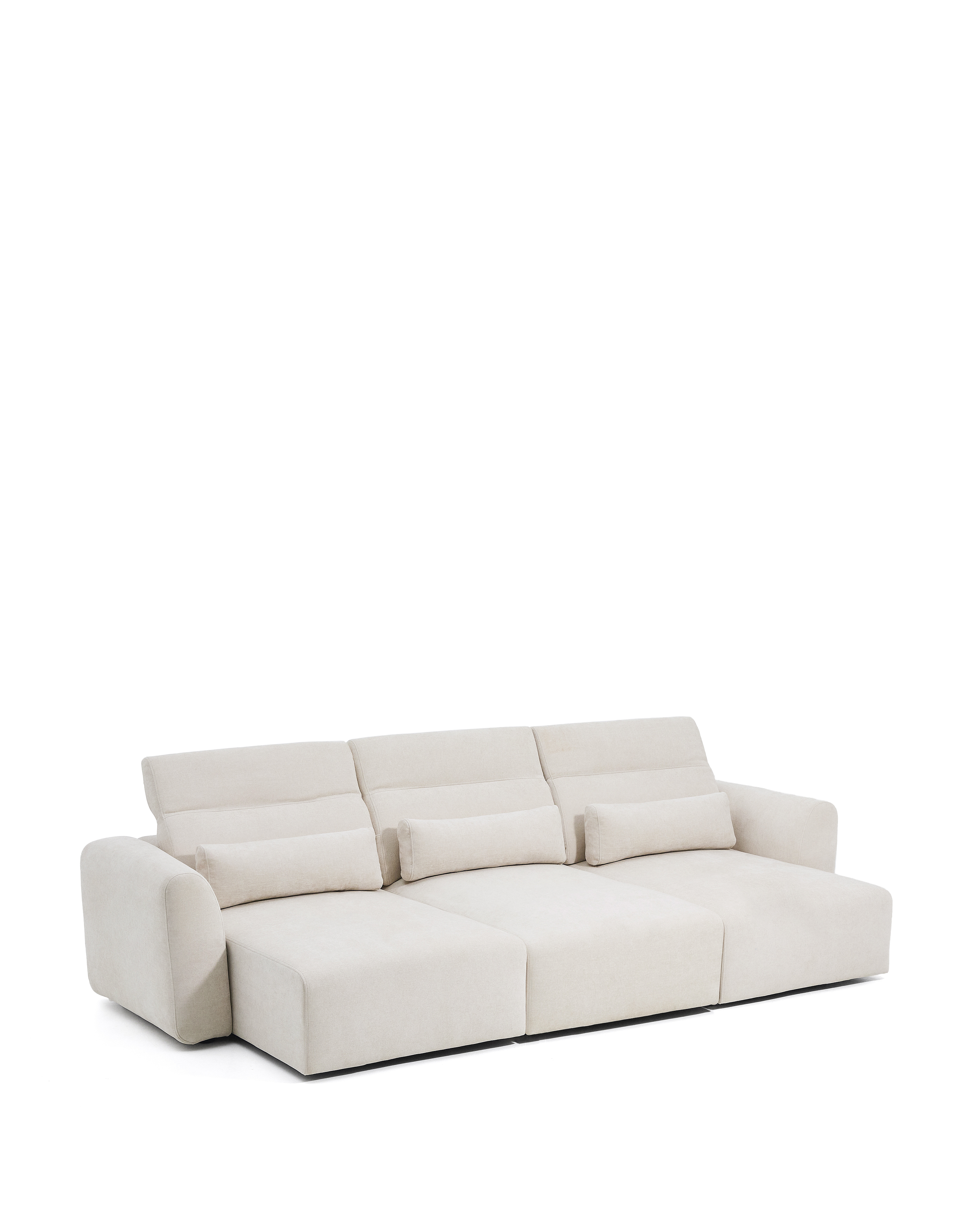This sofa combines design, comfort, and technology in a single piece of furniture. The motorized seats and manually reclining headrests allow you to adjust your posture at any time. The 99 cm depth makes it a compact extendable sofa, gaining up to 60 cm when opened. The seat extension can be kept open in any position. Movement can be controlled with a wireless remote control or via a Bluetooth-enabled smartphone app, which includes a Safe Mode for controlled use. _x000D_ _x000D_ The chenille upholstery features a fine structure, a velvety feel, high resistance to light and abrasion, and is machine washable on a delicate cycle. The fabric supplier is OEKO-TEX® STANDARD 100 certified, guaranteeing environmentally safe and responsible production._x000D_ _x000D_ Inside, the seat combines a NOSAG spring system with layers of high-density foam (35 kg/m3 and 40 kg/m3), 5 cm of 42 kg/m3 viscoelastic, and a layer of fiber, creating a medium-soft seating position. The headrests are removable and incorporate 35 kg/m3 soft foam, 24 kg/m3 super-soft foam, and fiber for greater comfort._x000D_ _x000D_ Made in Europe, this sofa offers quality and durability over time and helps reduce CO2 emissions. A spacious and versatile piece of furniture, designed to enjoy careful design and innovation in everyday life.