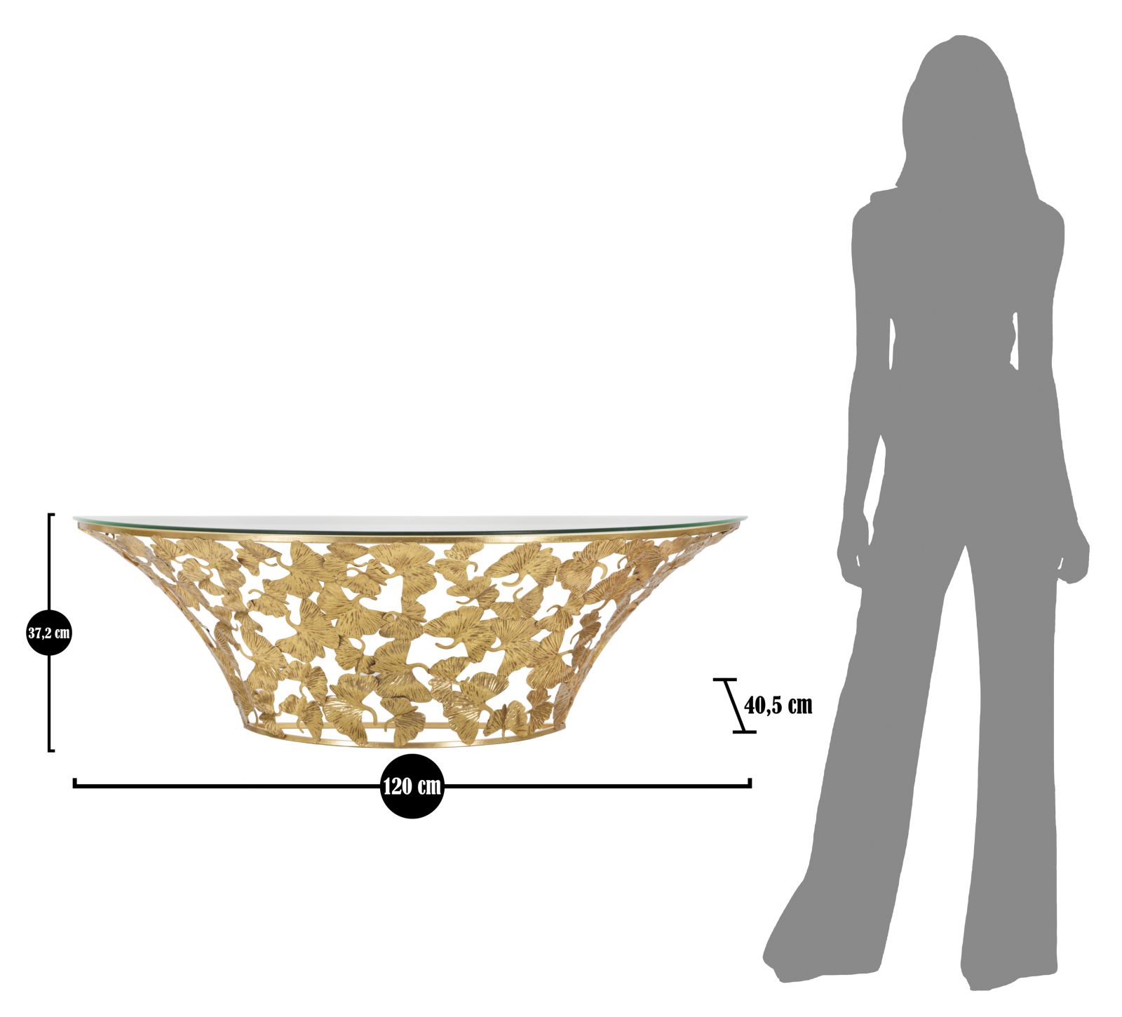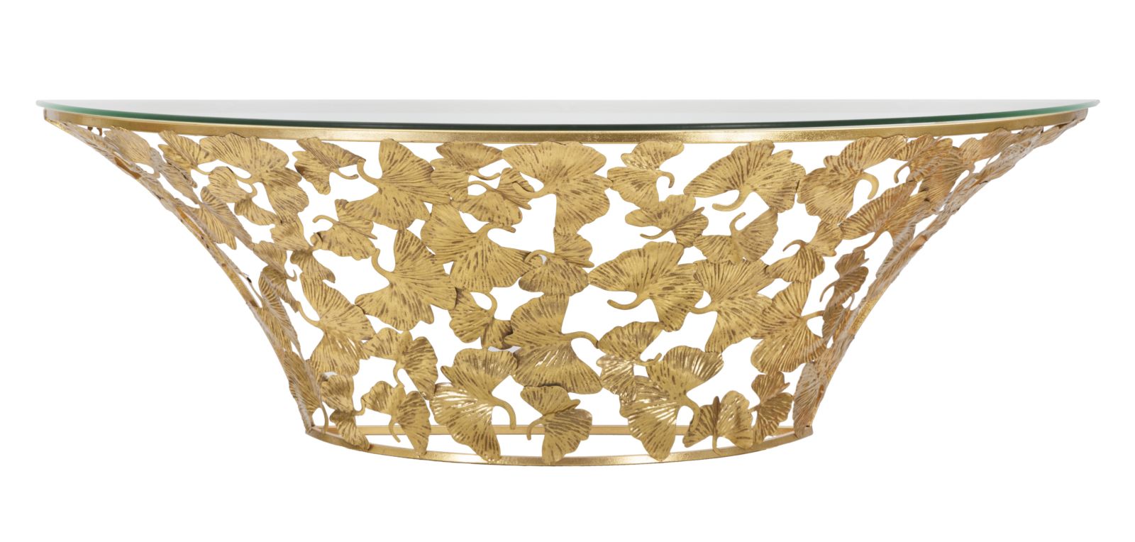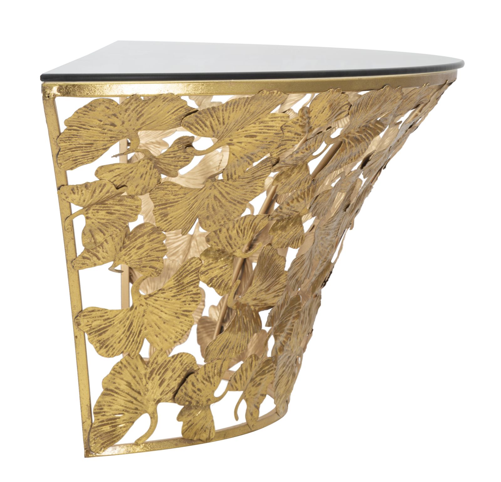 Semicircular wall console in golden metal with glass top. The base is richly decorated with leaves. The particular design gives a touch of class and relaxation to any environment.