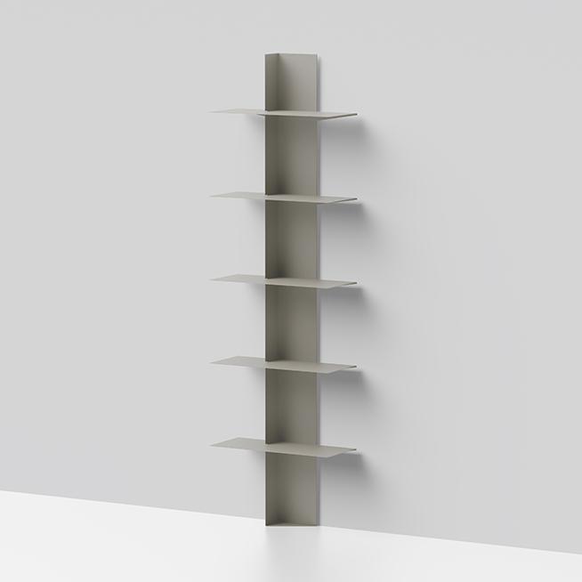 The LIFT wall bookcase is made with aluminum shelves and a painted steel column.