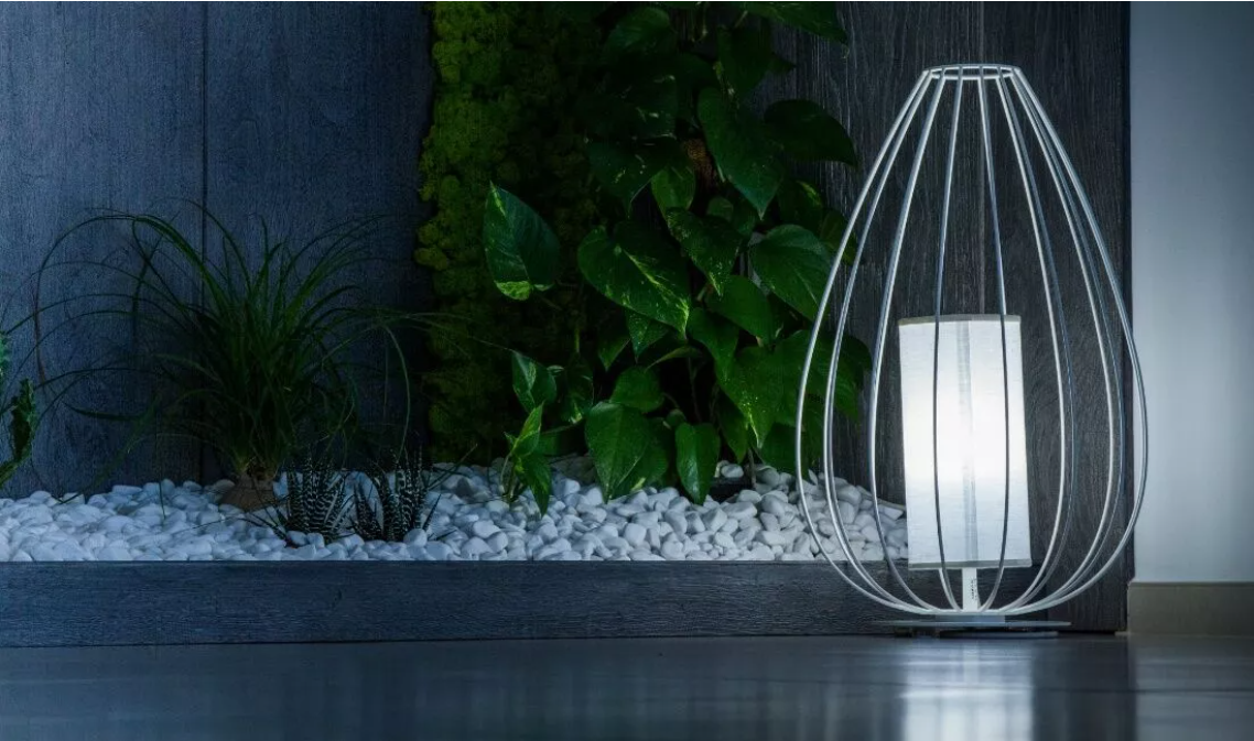 The white linen shade inside the cage allows the lamp to emit light softly and glare-free into the room, creating a pleasant atmosphere.