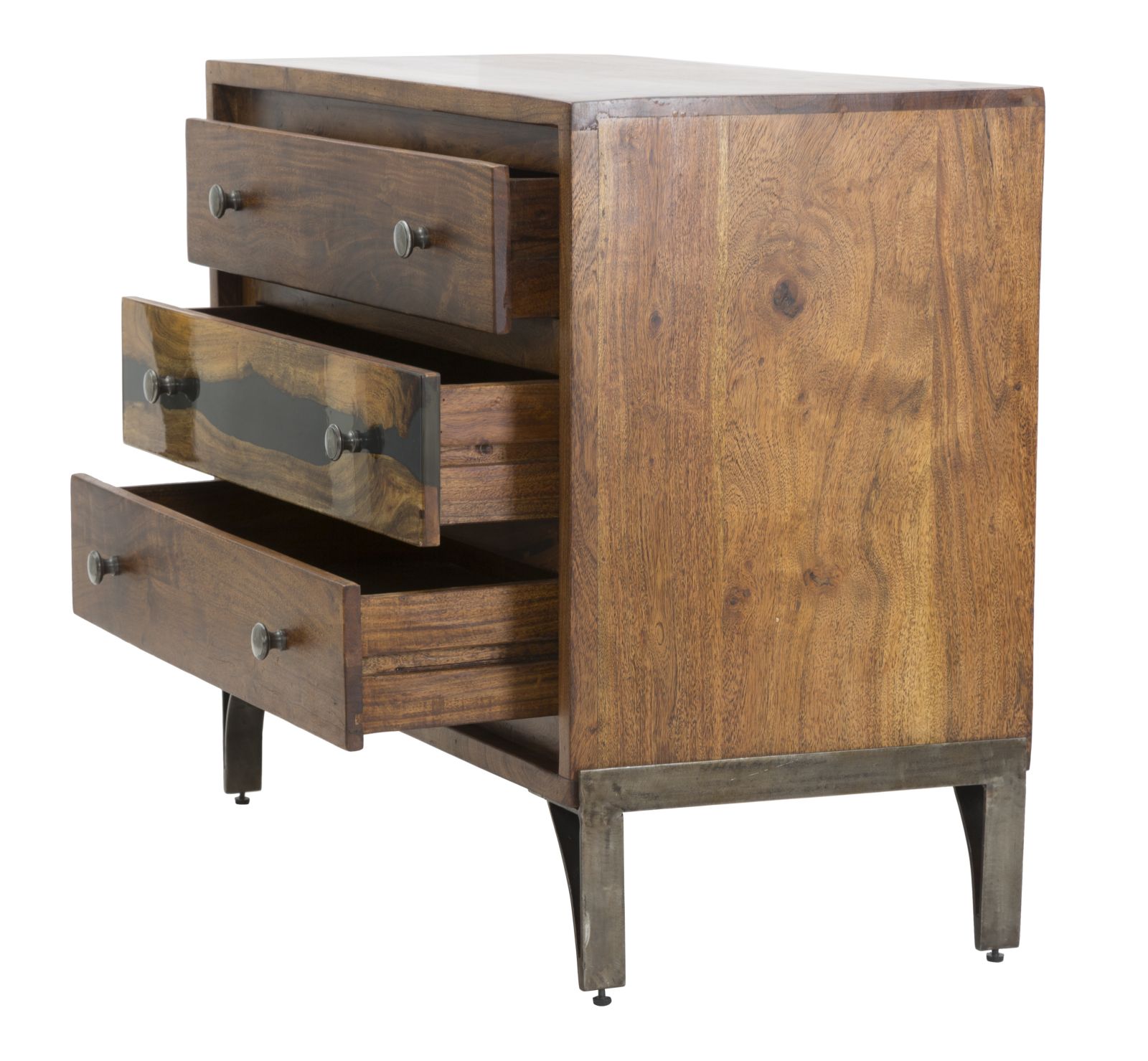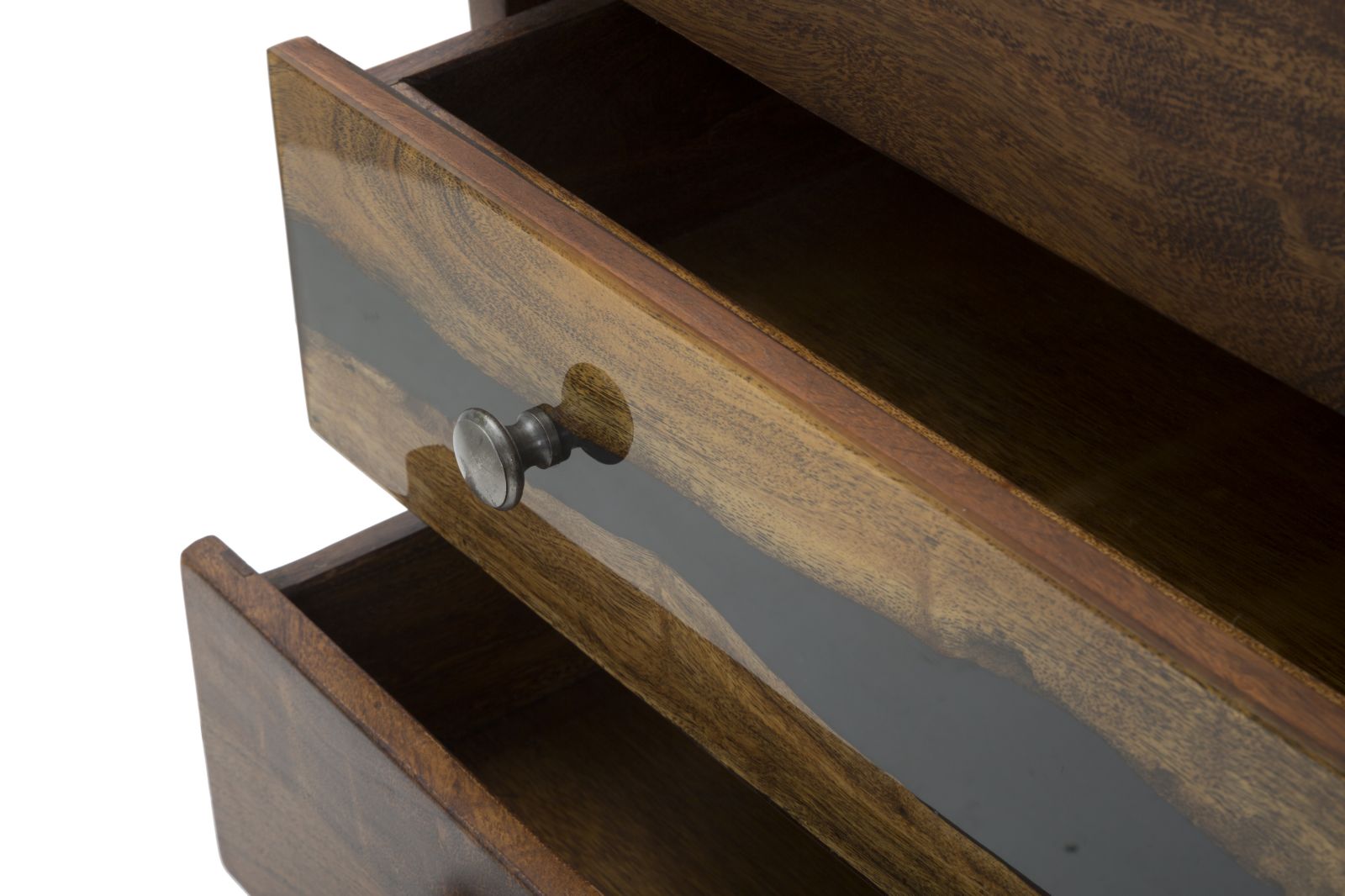 Elegant chest of drawers in solid acacia wood with 3 drawers. The particular workmanship with resin set on the drawers gives a touch of color and modernity to an extremely elegant and classic piece.