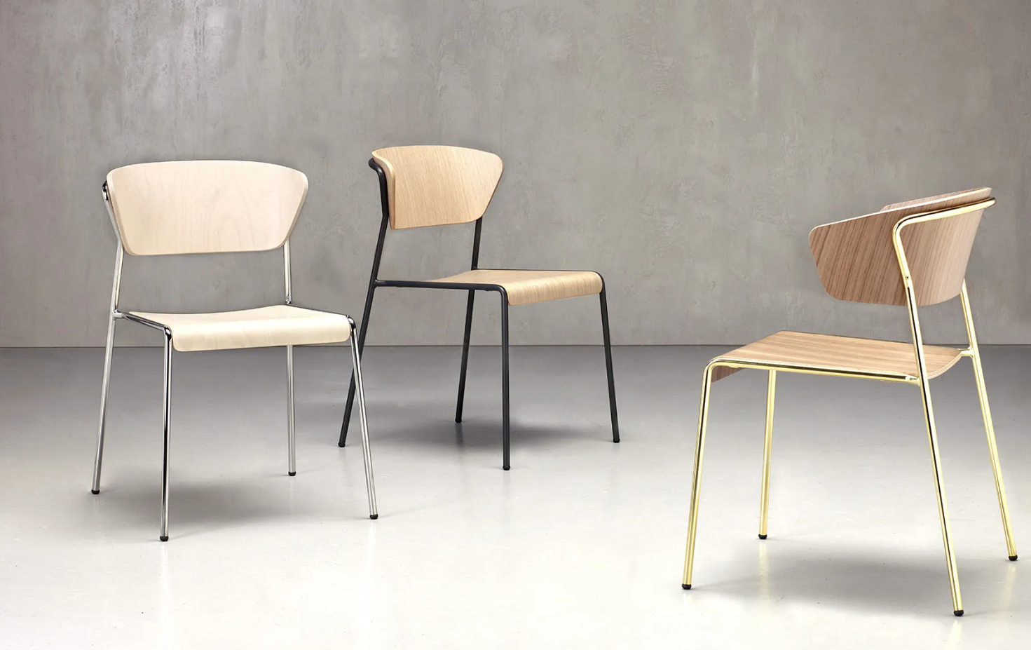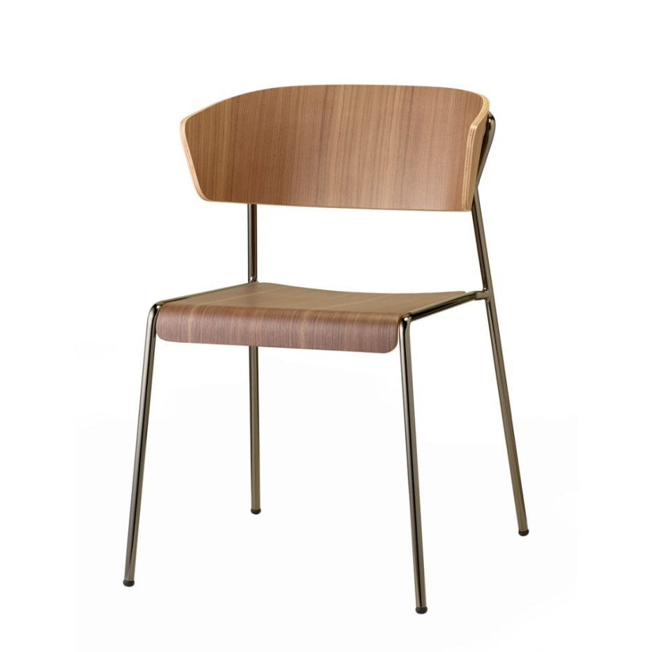 The seat and backrest, made of curved beech plywood , give warmth and refinement, while the painted steel structure guarantees solidity and visual lightness.