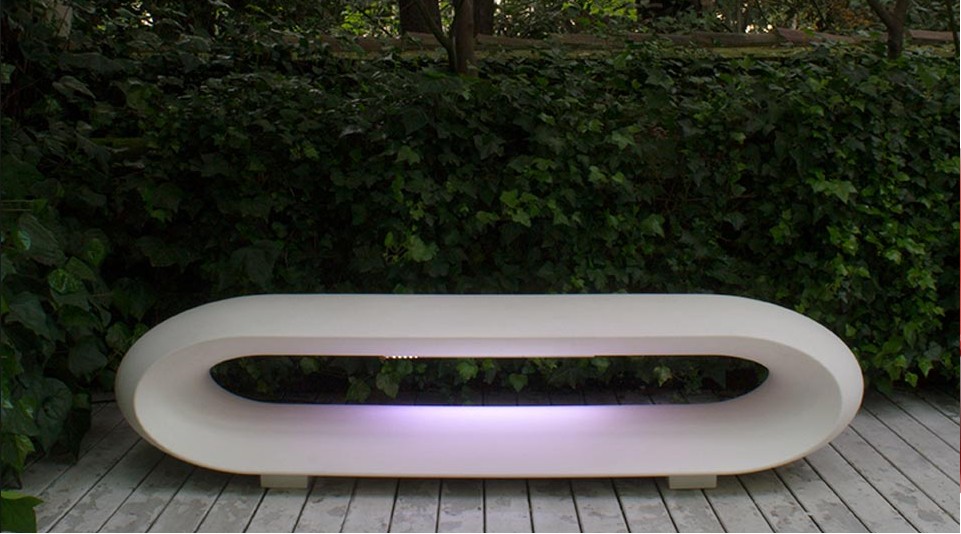 Its curved, essential and enveloping design stands out for its fluid and modern shapes, while the integrated LED lighting gives the bench a suggestive luminous presence, ideal for gardens, terraces, public places, hotels and contract spaces.