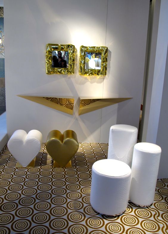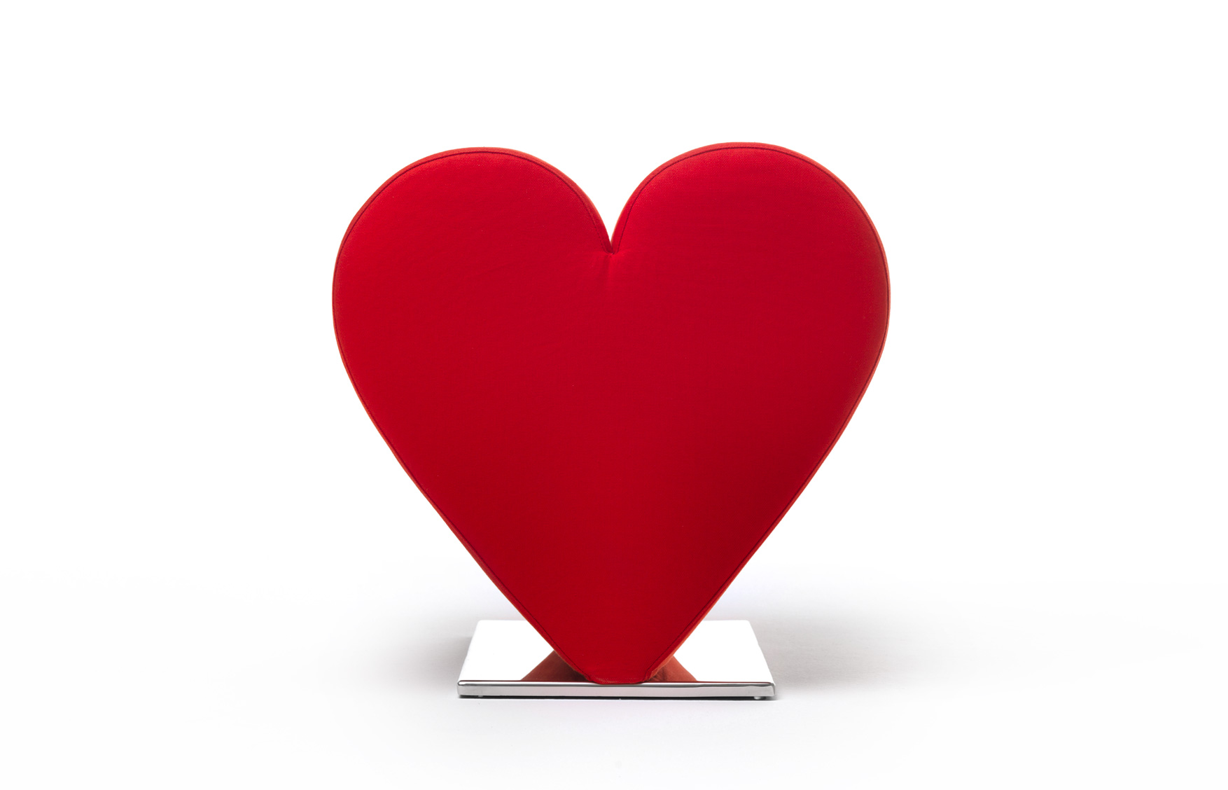 Iconic seat in polyurethane foam covered in 100% cotton. Base in polished stainless steel. Emotional armchair with heart- shaped profile , colorful and original piece of furniture to recreate a romantic atmosphere in any environment.
