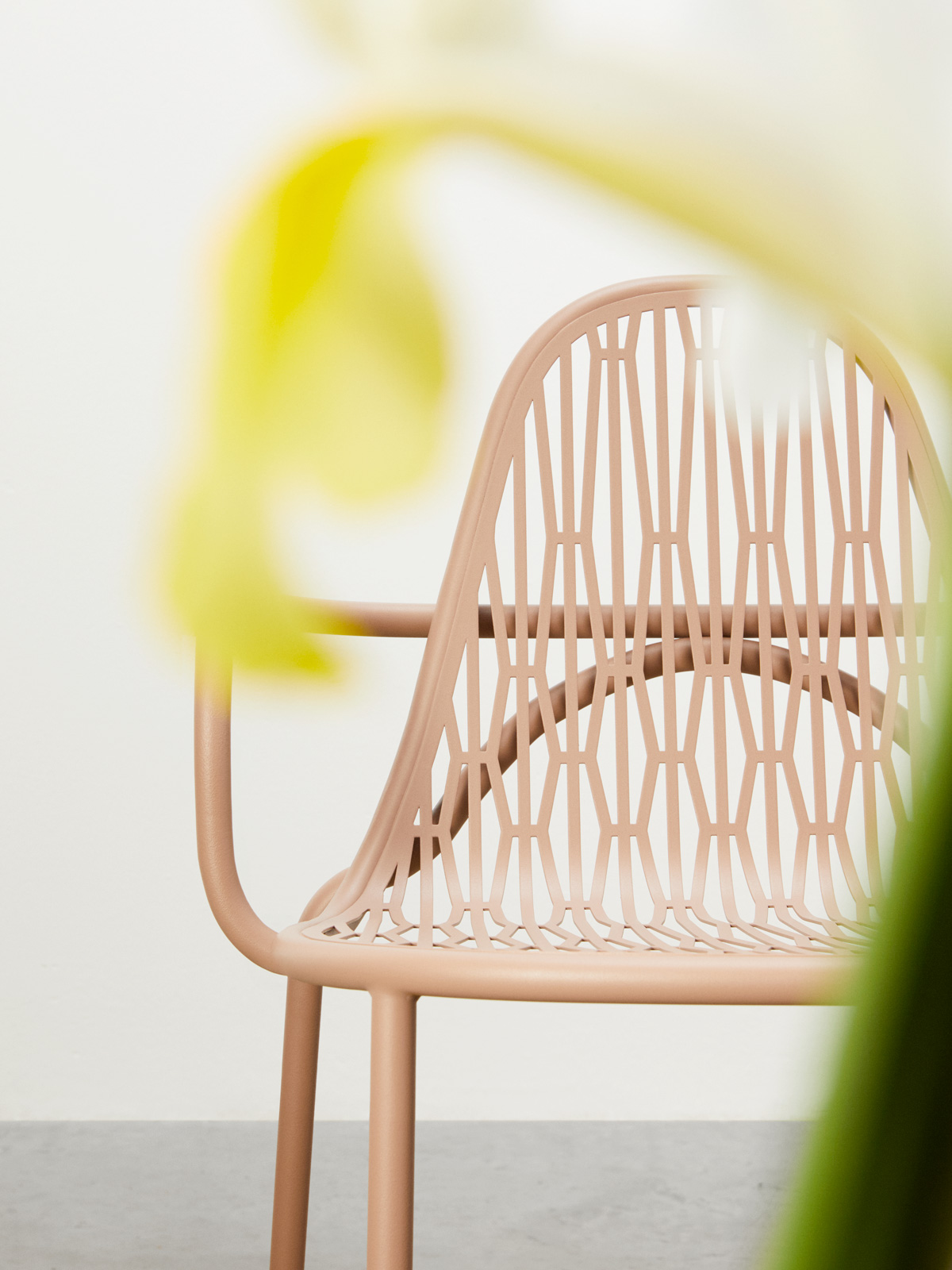 Malvasia is an outdoor seat that, through its metallic textures, creates refined interweavings of light and shadow.