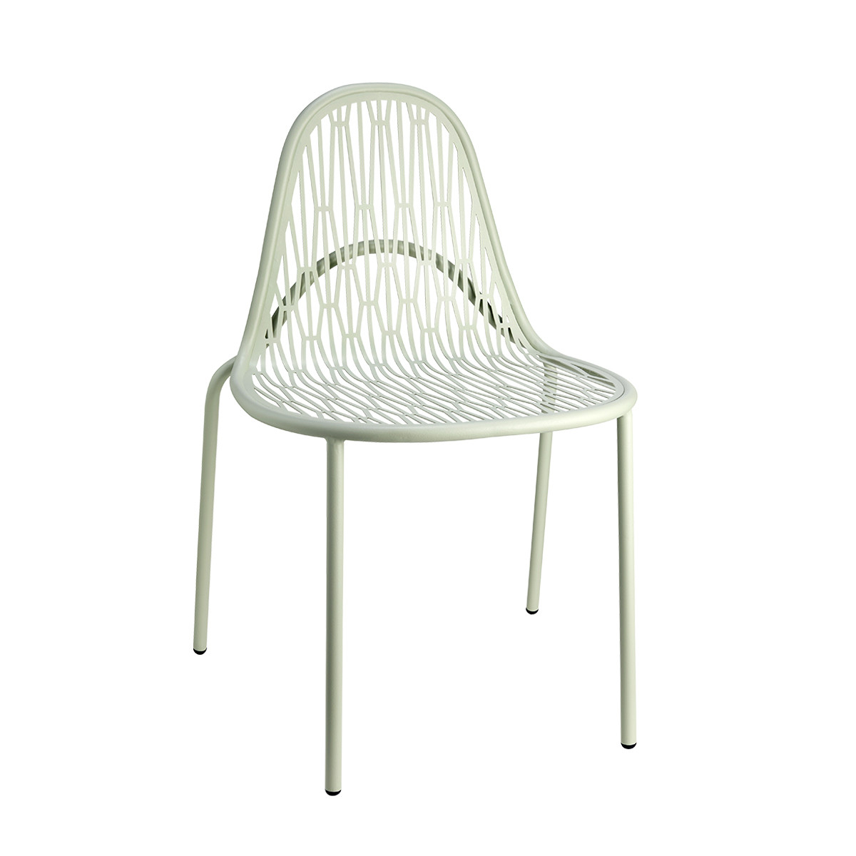 Although it appears simple, Malvasia’s design represents an engineering challenge: the backrest and seat are made from a single piece of perforated and calendered metal, then welded to the tubular frame with such precision that the joints are almost invisible.