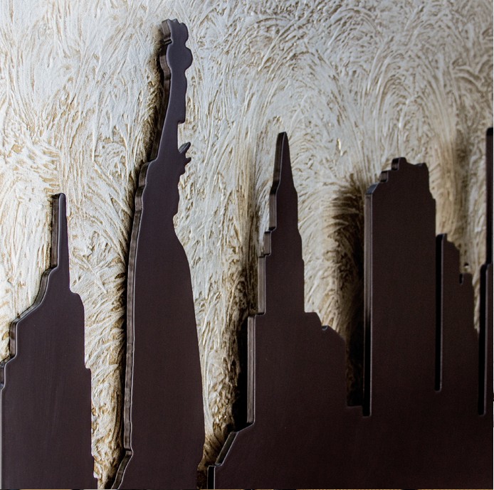 Coffee lacquered shaped relief element on hand-decorated structure with silver leaf on textured, glossy finish.
