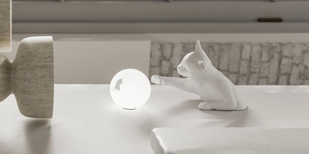 The cat seems to leap out of the wall or the table top to play and tease the little mouse in the luminous sphere with its paw.