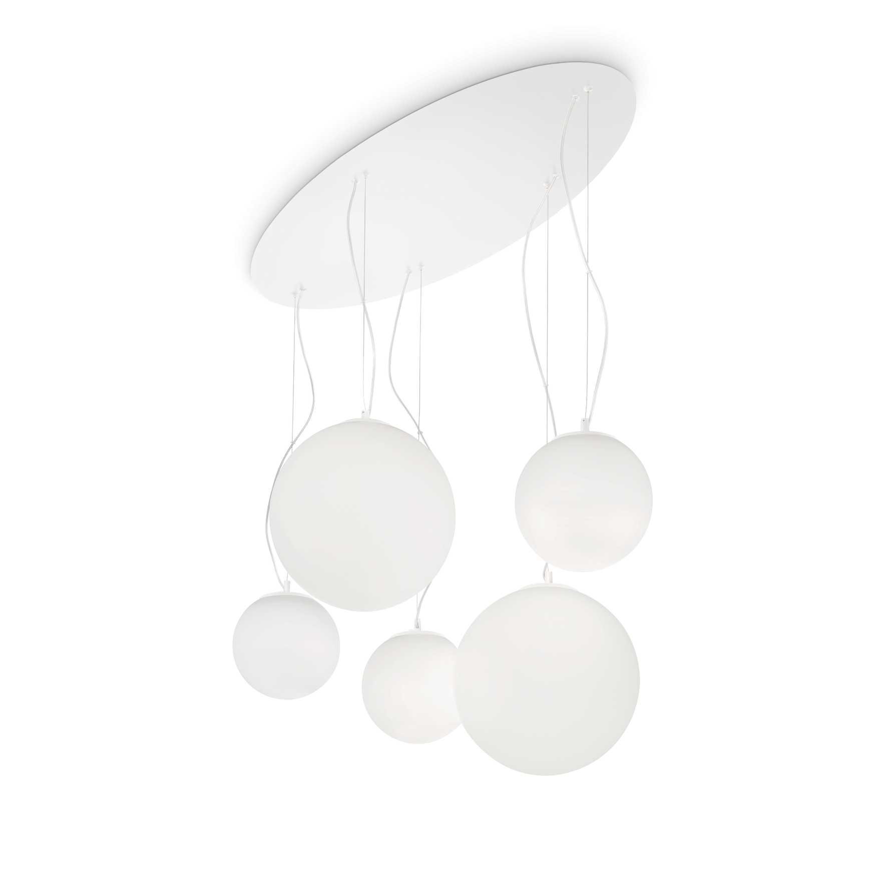 Metal frame with satin nickel finish. Sphere diffuser in white blown and etched glass. Suspensions with steel cables with adjustable length.