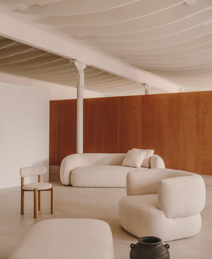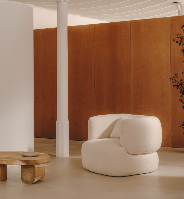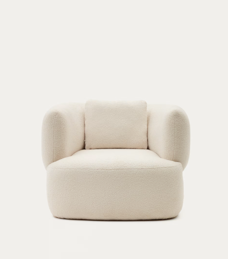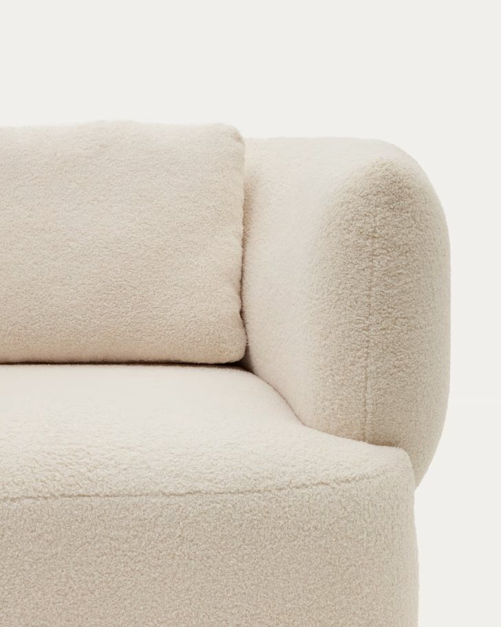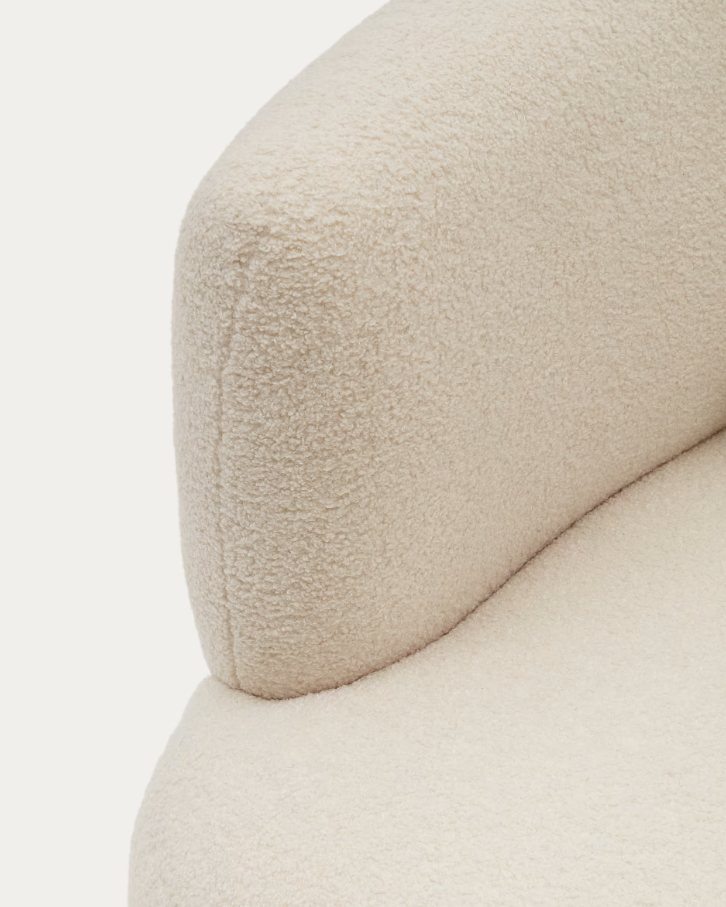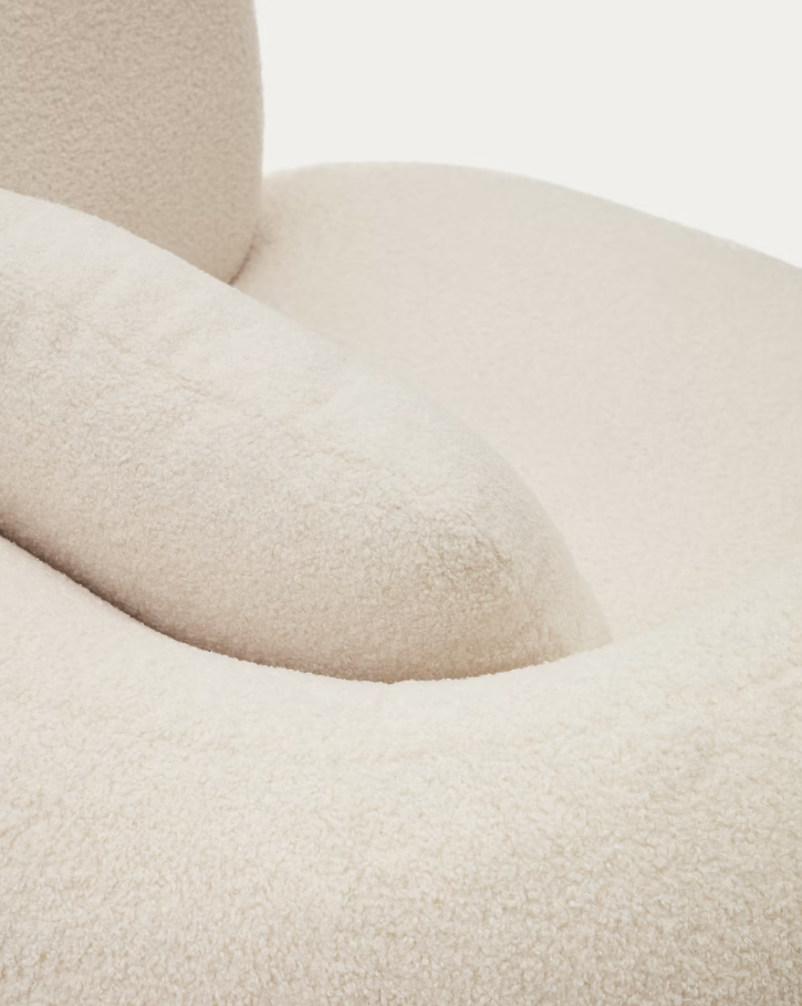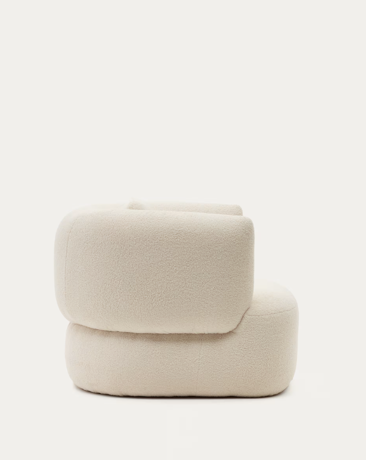 The Kave Home team created the Martina armchair for relaxation and to protect the planet. Its curved lines and 100% recycled polyester lining with a lambskin effect make it the perfect piece for your living room.