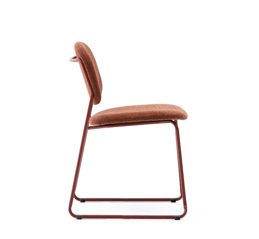 This chair redefines functional elegance for any space. The backrest and seat, upholstered in soft chenille with internal poplar plywood reinforcement, offer exceptional comfort. This fabric is also OEKO-TEX® STANDARD 100 certified, guaranteeing environmentally responsible production. The design is complemented by micro-textured metal legs in a subtle terracotta hue, adding a modern and refined touch. The wood used is FSC Mix Credit certified, guaranteeing a mix of materials from FSC-certified forests and FSC-controlled wood. Leg protectors ensure floor protection, adding functionality without compromising aesthetics. Details such as the exposed stainless steel screws with a double-hole design enhance its distinctive character.