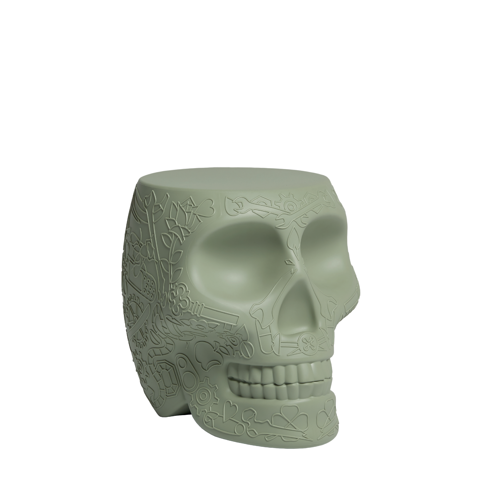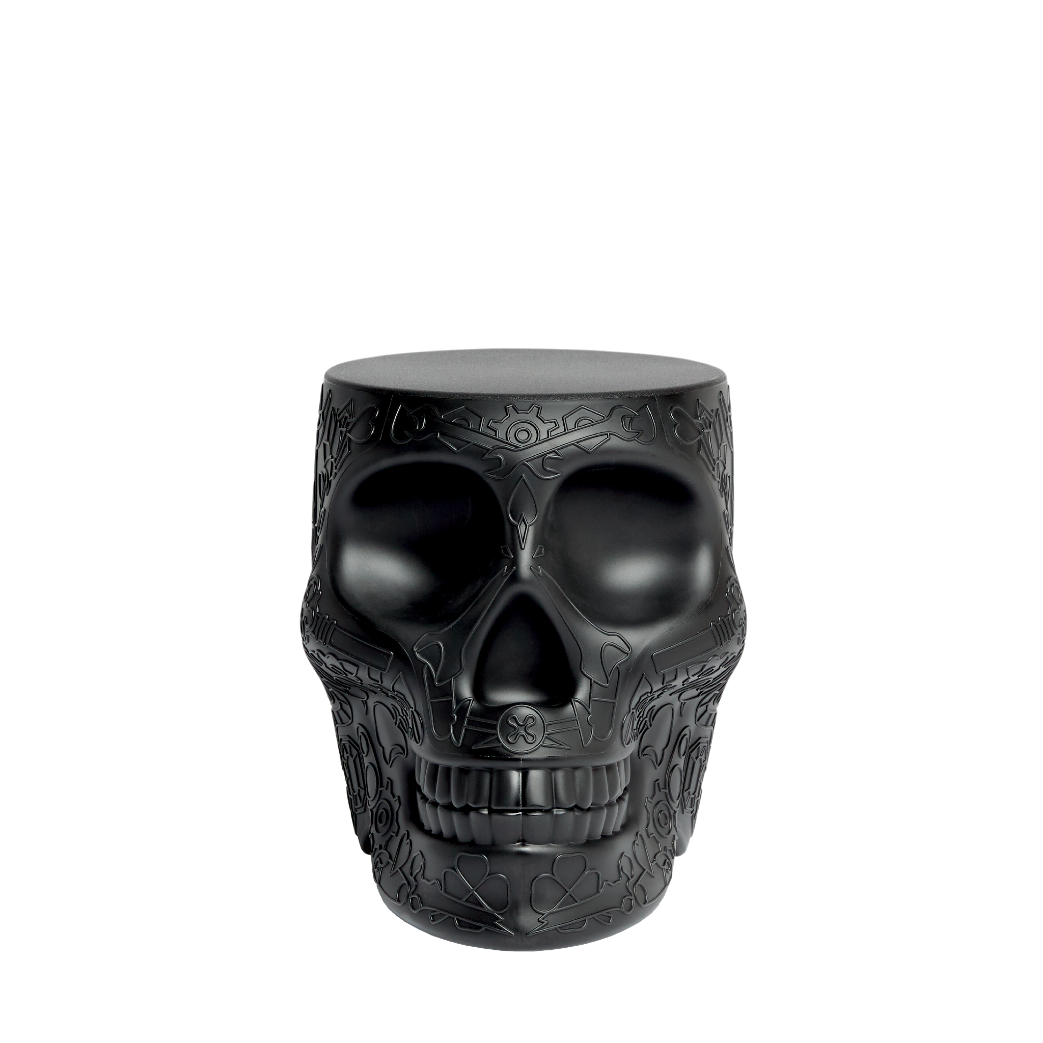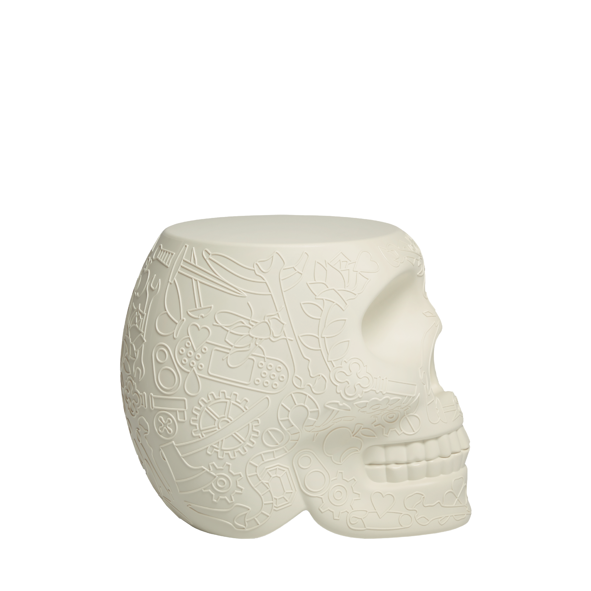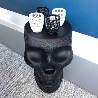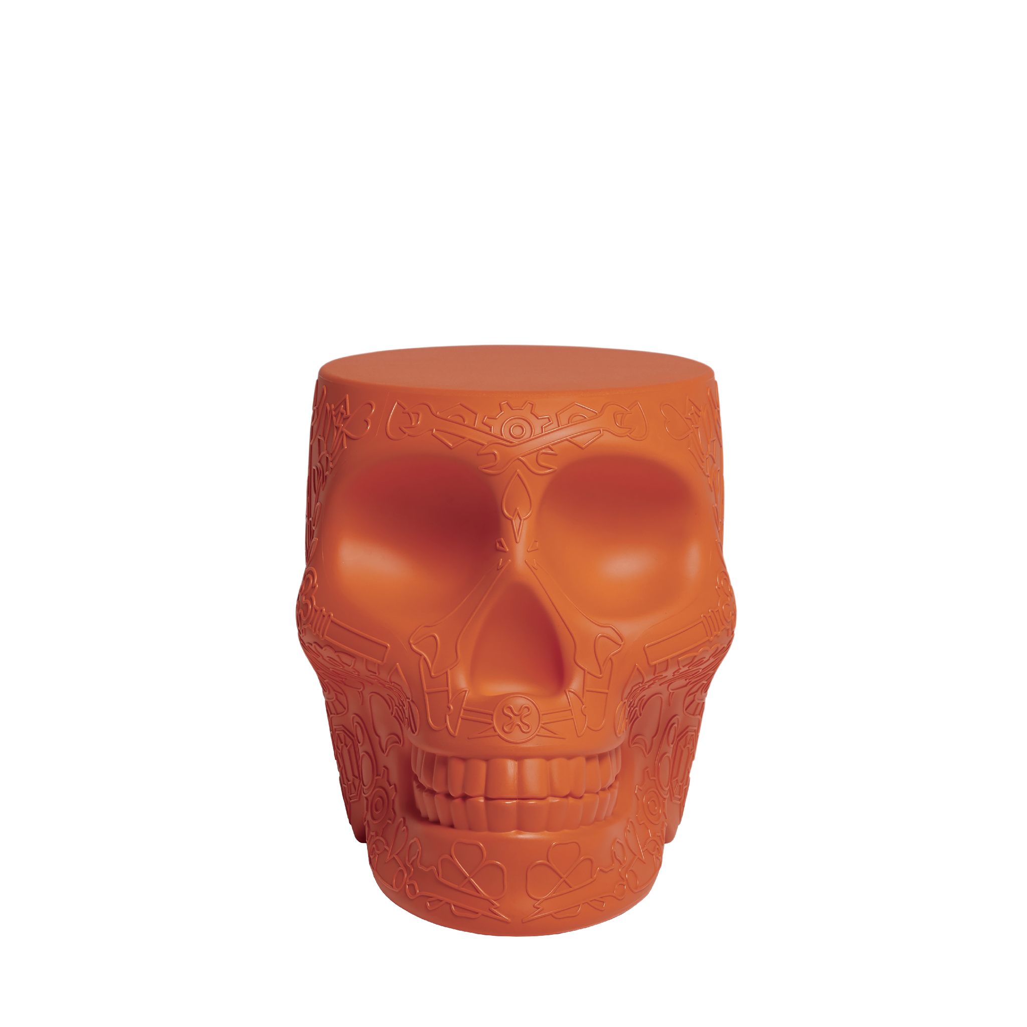 Mexico, designed by Studio Job, is a skull-like design object with a graphic motif on the surface, which functions as both a stool and a side table. Reminiscent of the traditional painted skulls of the homonymous country, Mexico is a whimsical reminder of the cyclical nature of our presence on Earth, to exorcise death and celebrate life. Perfect for lounge areas, dining rooms and outdoor spaces.