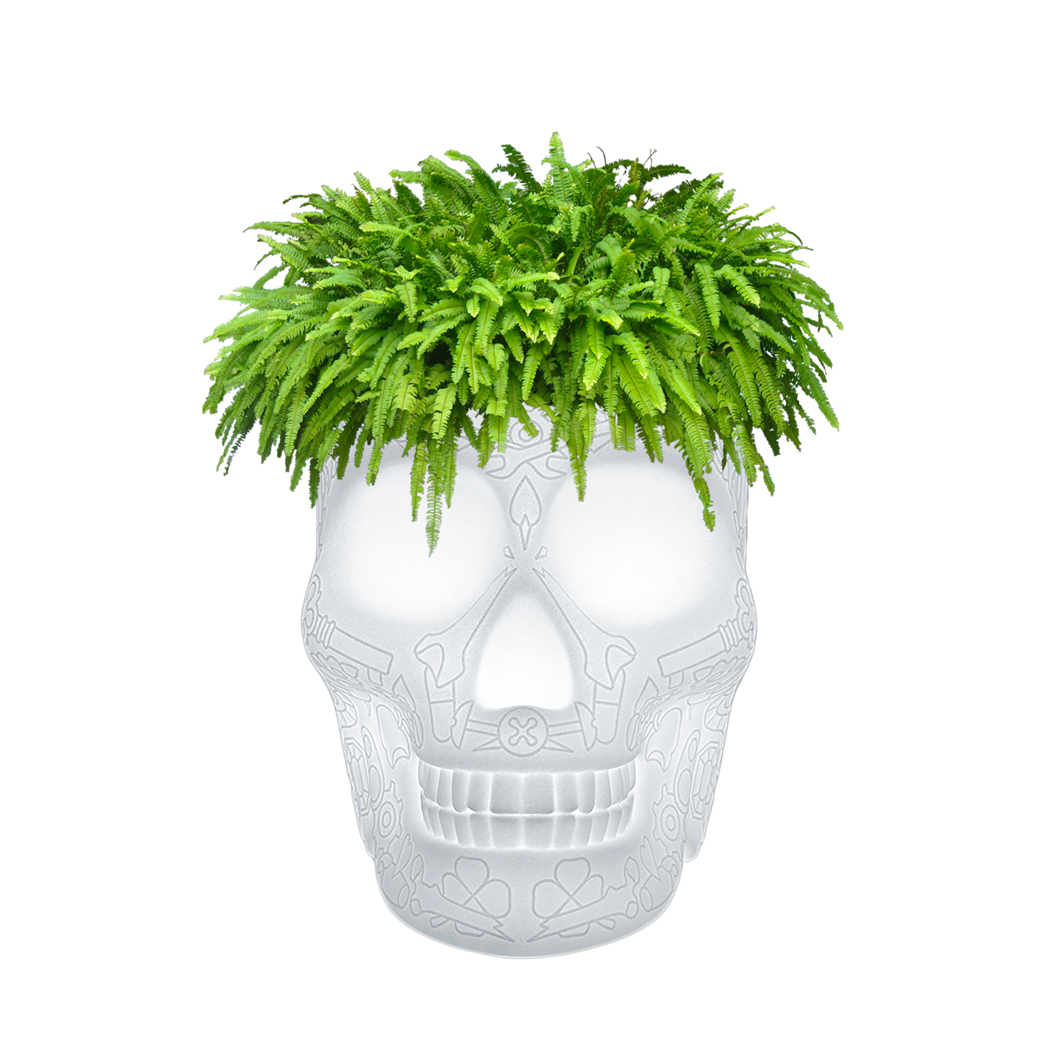 Mexico, designed by Studio Job, is a skull-shaped lamp with a graphic motif on the surface, which functions both as a plant holder and as a champagne cooler. Reminiscent of the traditional painted skulls of the homonymous country, Mexico is a whimsical reminder of the cyclical nature of our presence on Earth, to exorcise death and celebrate life. Perfect for lounge areas, dining rooms and outdoor spaces. Wireless, with rechargeable battery, LED light and 16 different interchangeable RGB colors, it can be remotely adjusted by remote control.