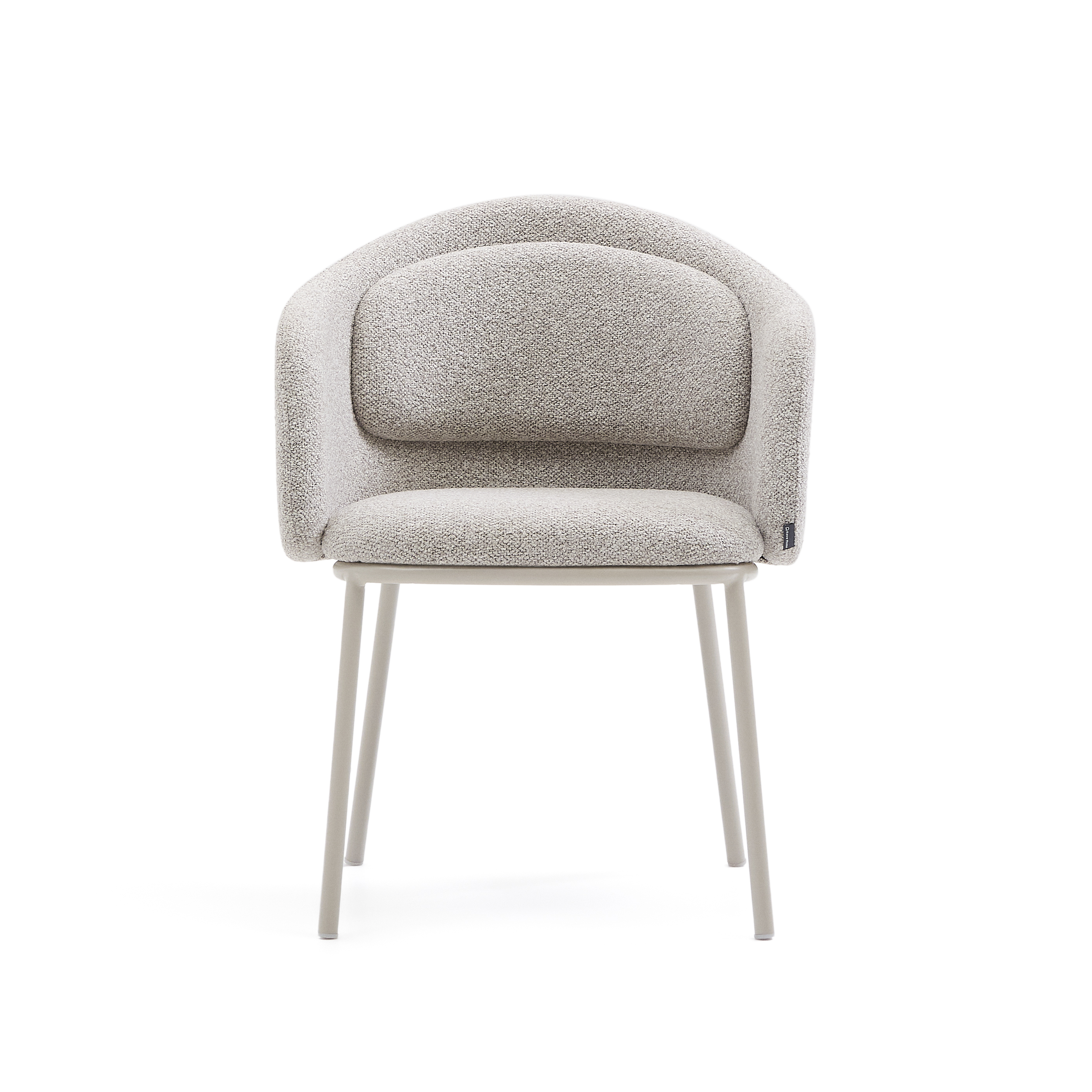 Minda chair in thick beige chenille with steel legs in a blue finish. FSC Mix Credit.