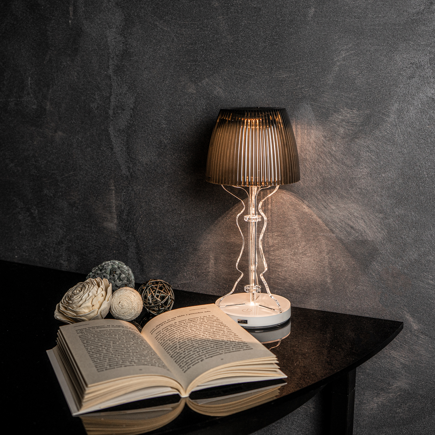 Table lamp with structure in transparent acrylic crystal, prismatic cap and gray lamp holder.