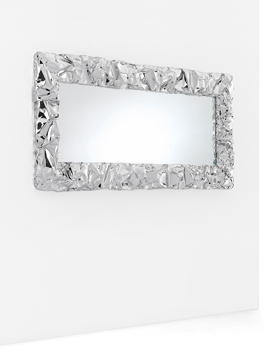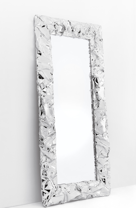 Mirror with hand-wrinkled chromed aluminum frame, hangable on both sides. Craftsmanship, each piece is unique.