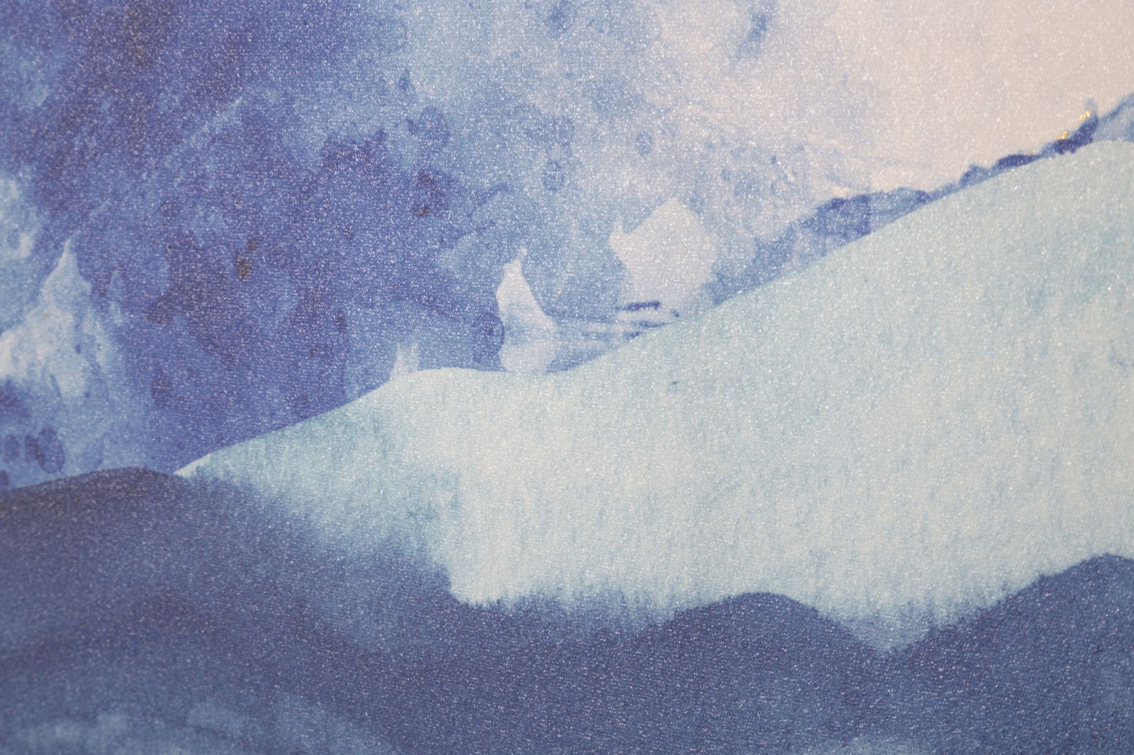 Impressionist design wooden framed canvas print reminiscent of a mountain landscape. The shades of blue combined with the golden decorations create a delicate contrast that gives a touch of magic to any room.
