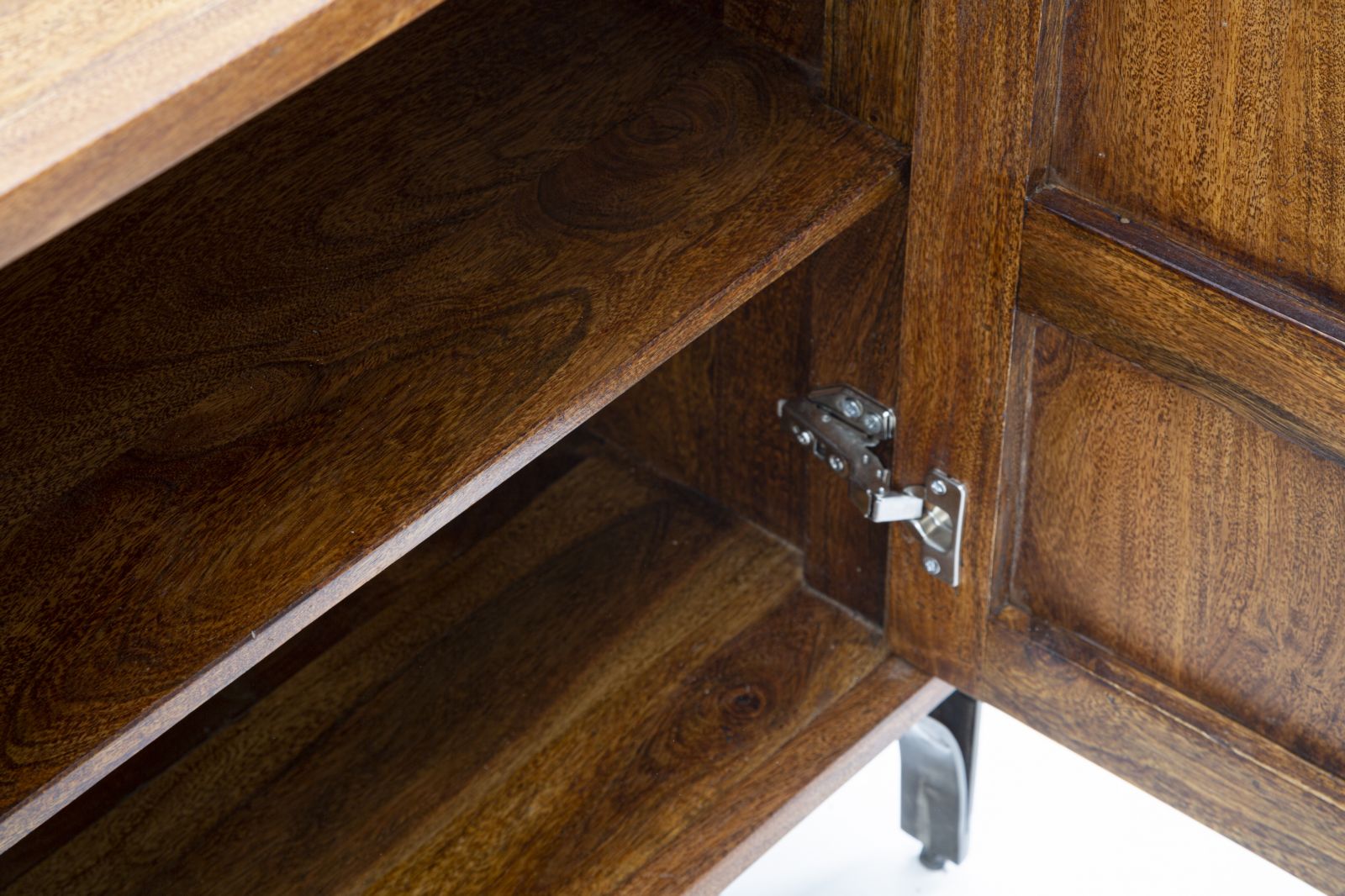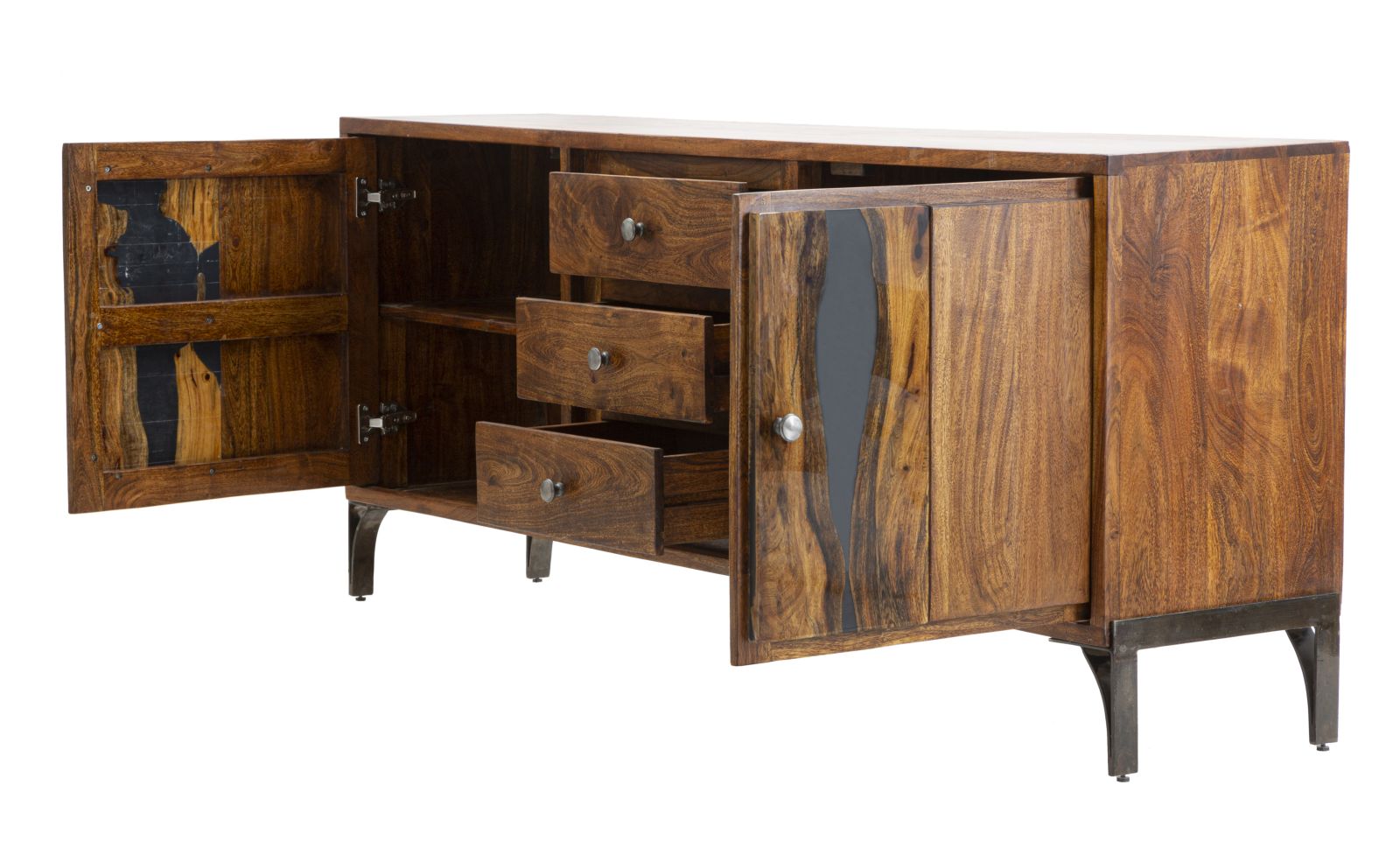 Elegant cabinet in solid acacia wood composed of 2 doors and 2 drawers. The particular processing with resin set on the doors gives a touch of color and modernity to an extremely elegant and classic piece.