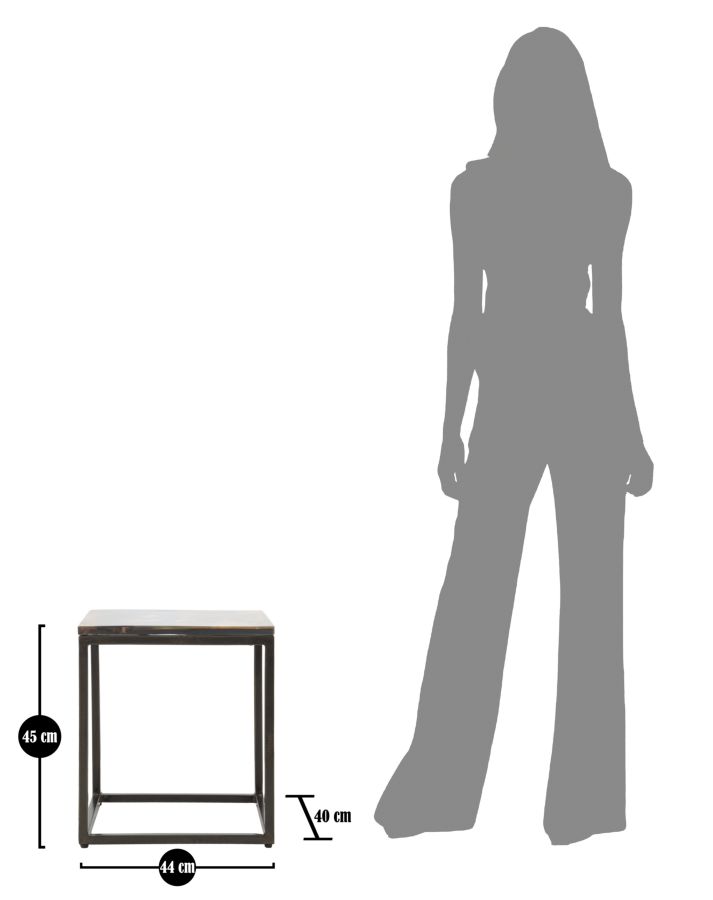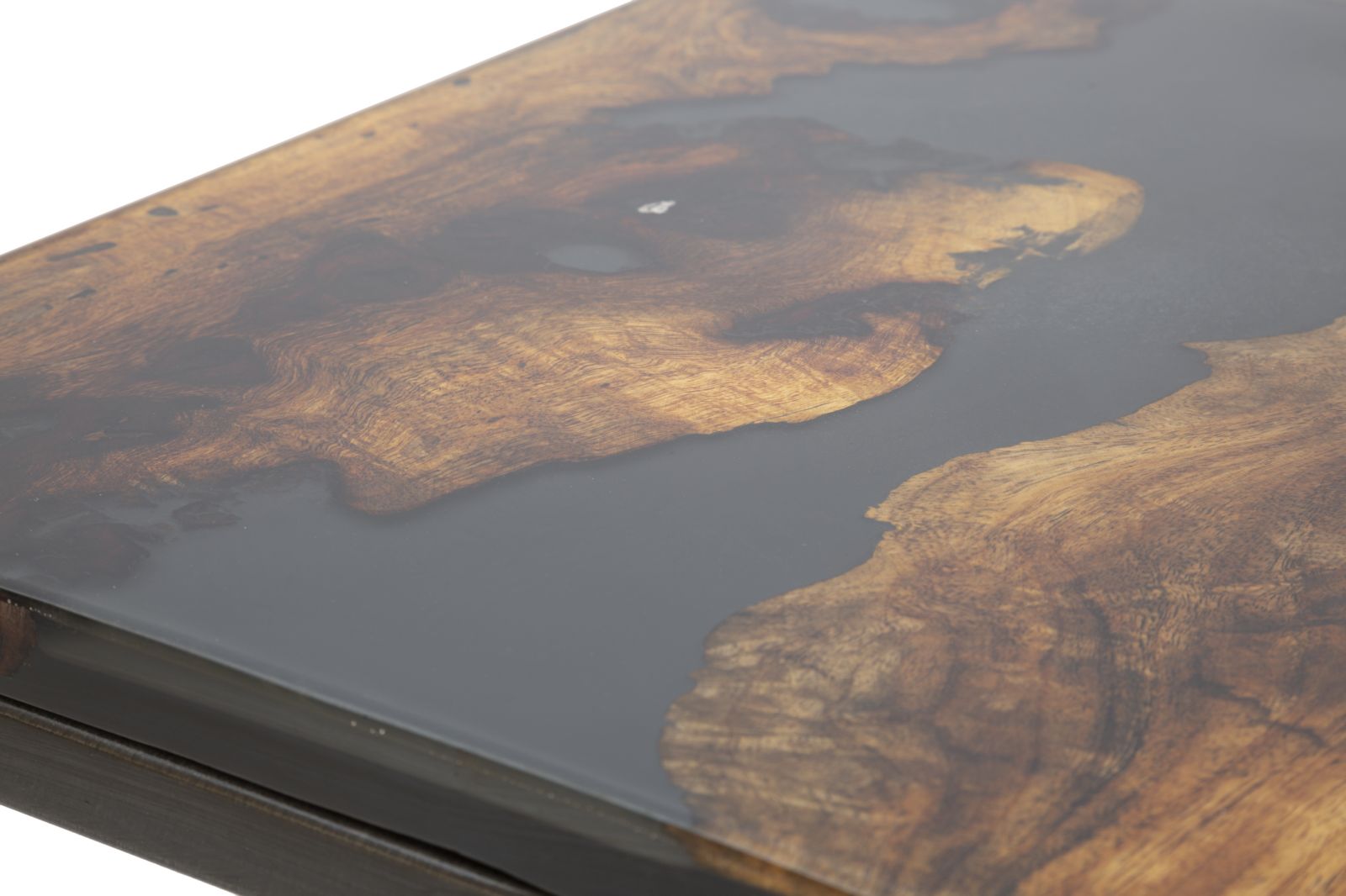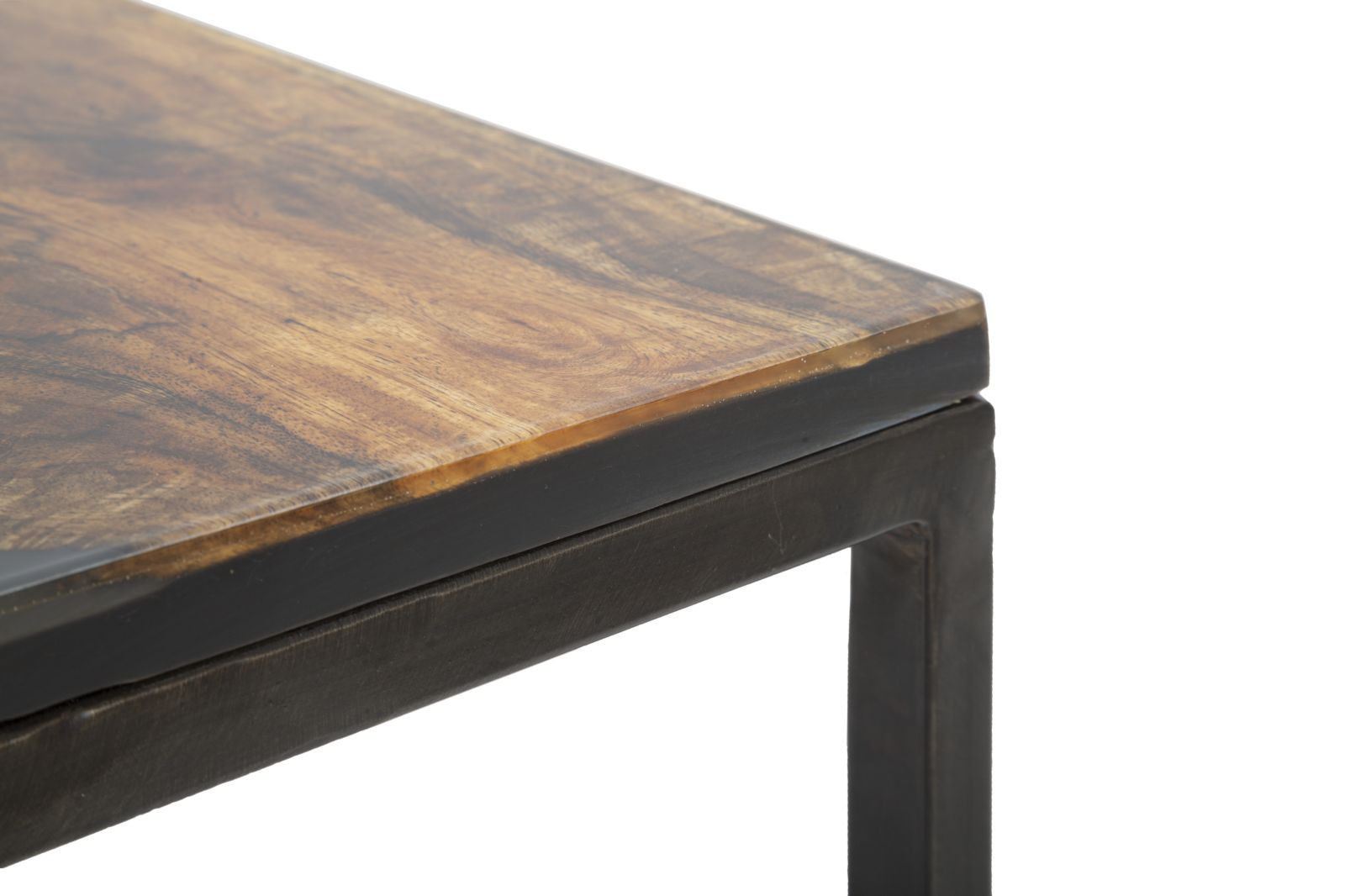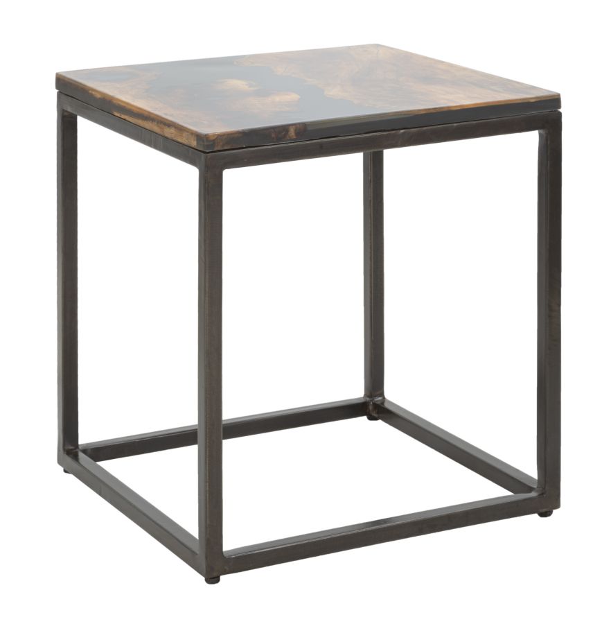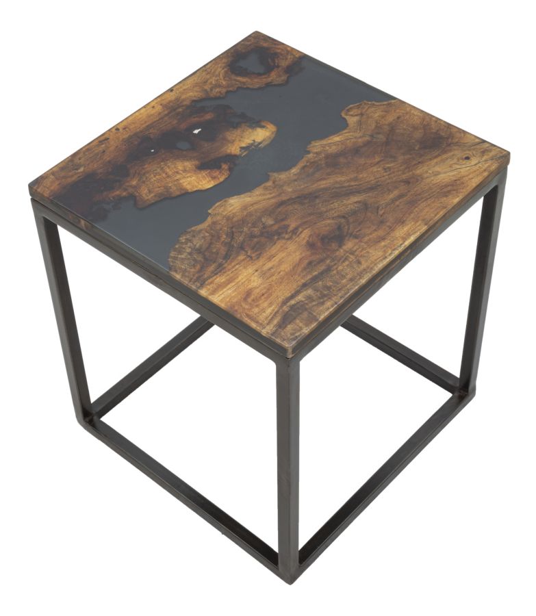 Elegant square coffee table with solid acacia wood top and black metal structure. The particular workmanship with resin set on the top gives a touch of color and modernity to an extremely elegant and classic piece.