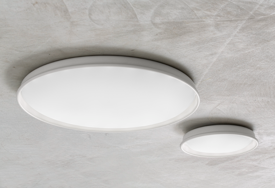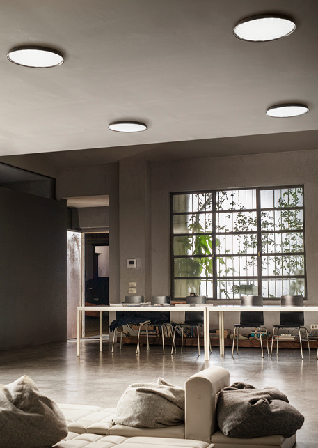 The pendant version is mounted on a rigid tube, while the ceiling version is also available with concealed accessories for installation on plasterboard surfaces.