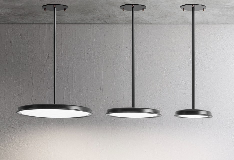 The pendant version is mounted on a rigid tube, while the ceiling version is also available with concealed accessories for installation on plasterboard surfaces.