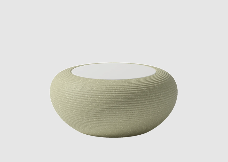 Nami is a round table with a recyclable polyethylene body and a painted glass top.