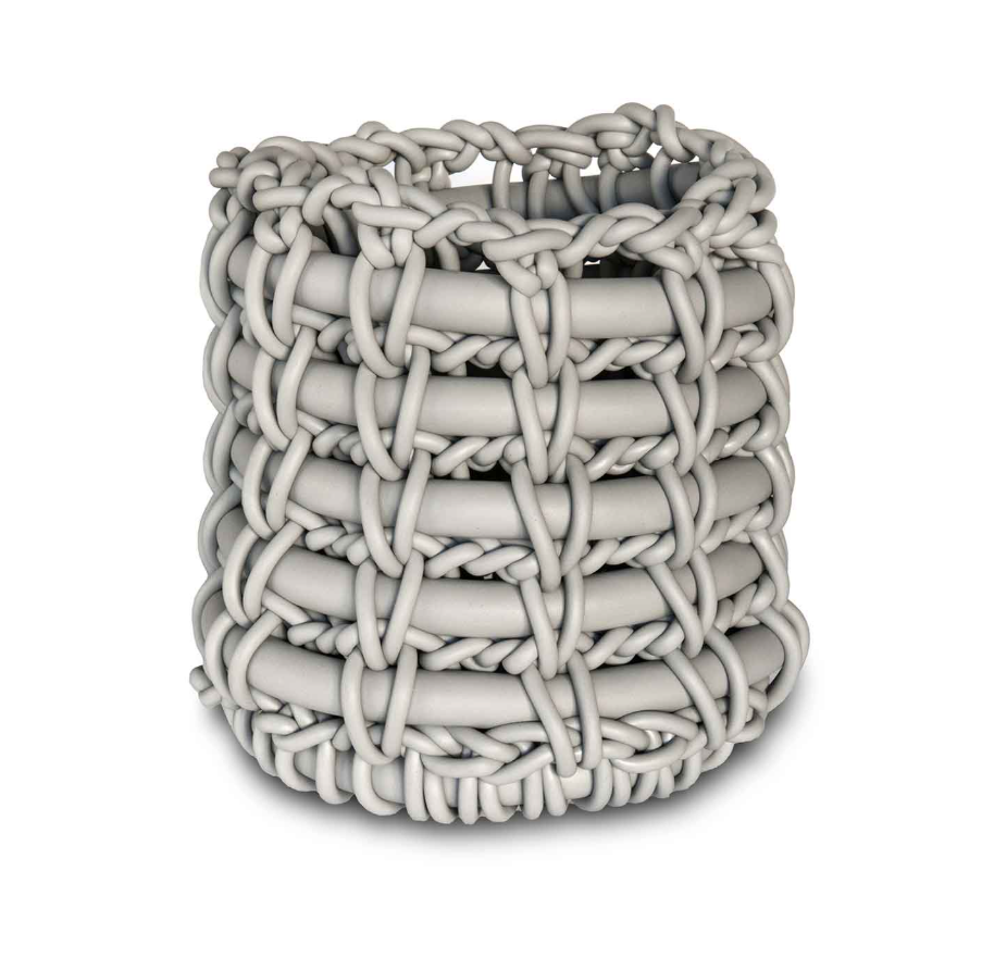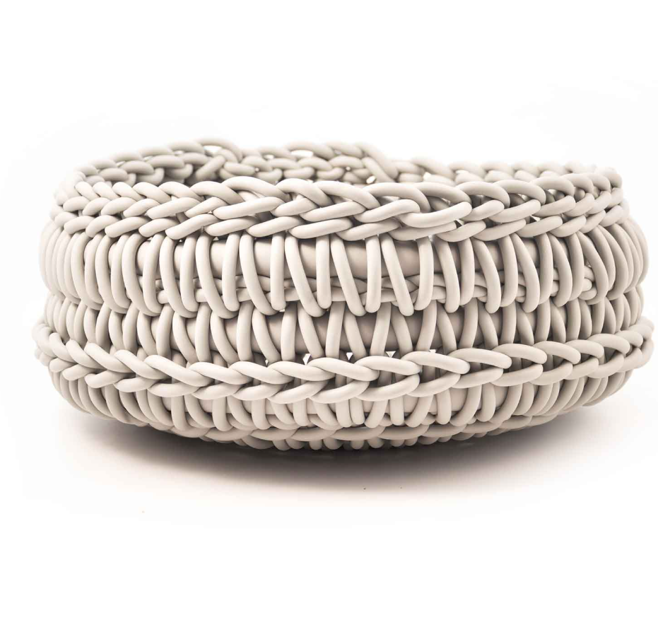 Nest basket knitted with neoprene thread, a combination of softness and artisanal precision.
