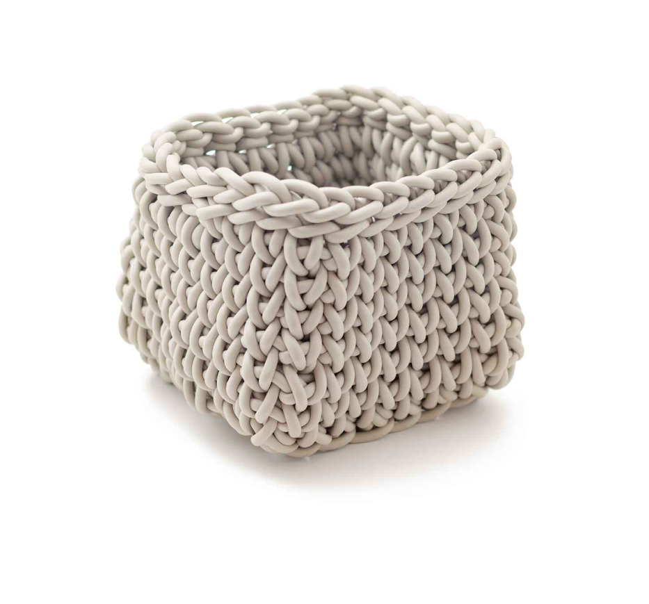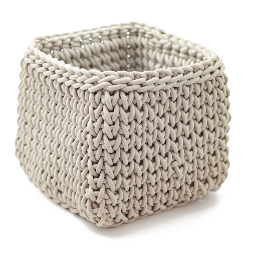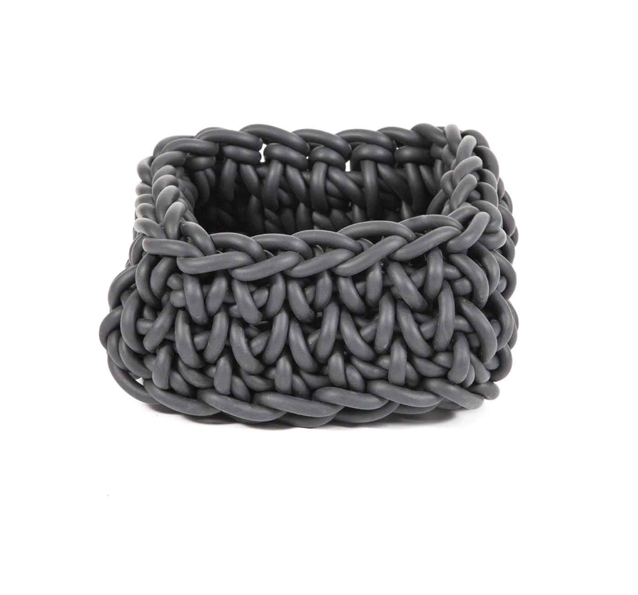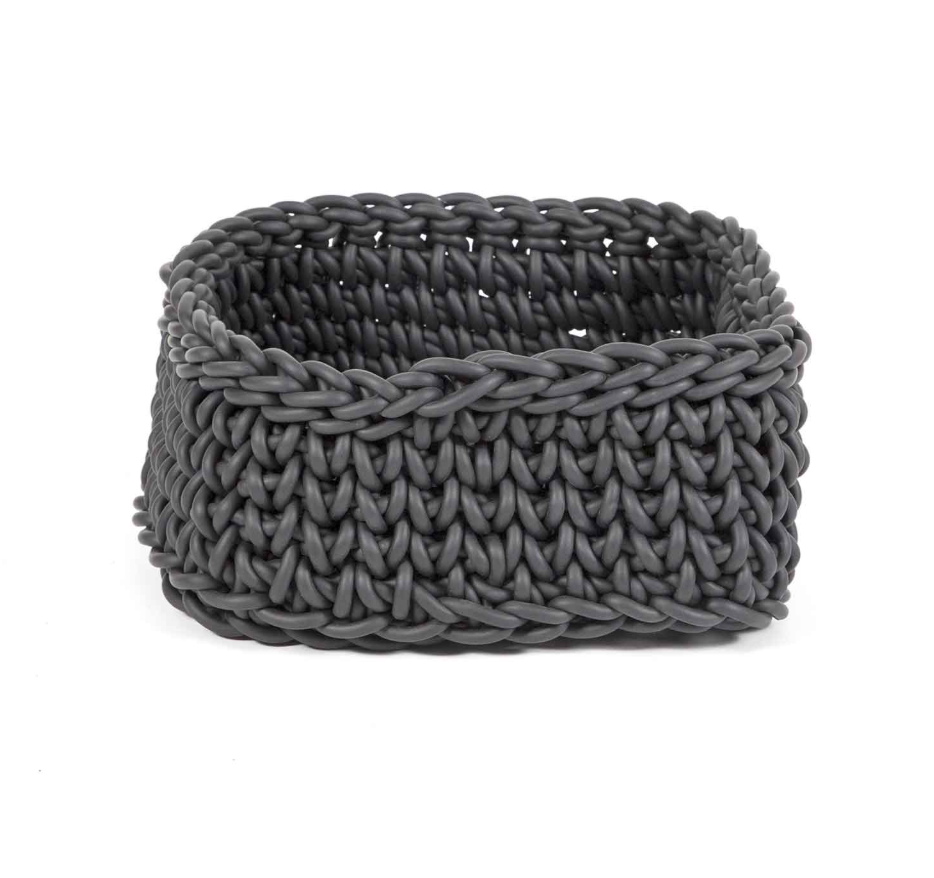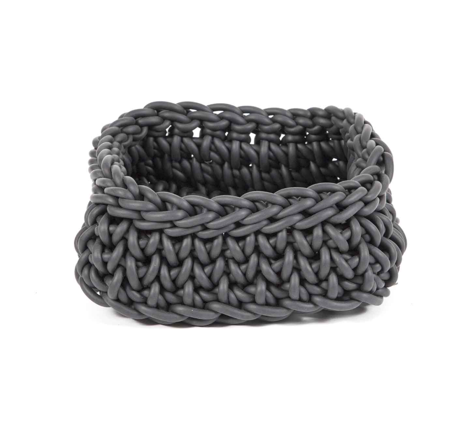 Handcrafted square basket in crocheted neoprene, with a compact and modern design.