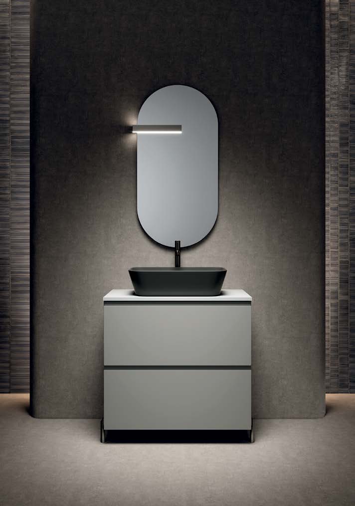 The integrated sink , in harmony with the linear design of the cabinet, gives balance to the environment. The coordinated mirror , also available with LED lighting, adds a touch of modernity and improves the brightness of the bathroom space.