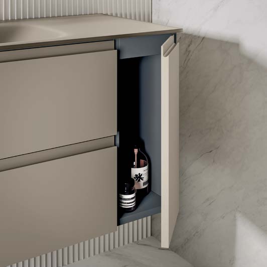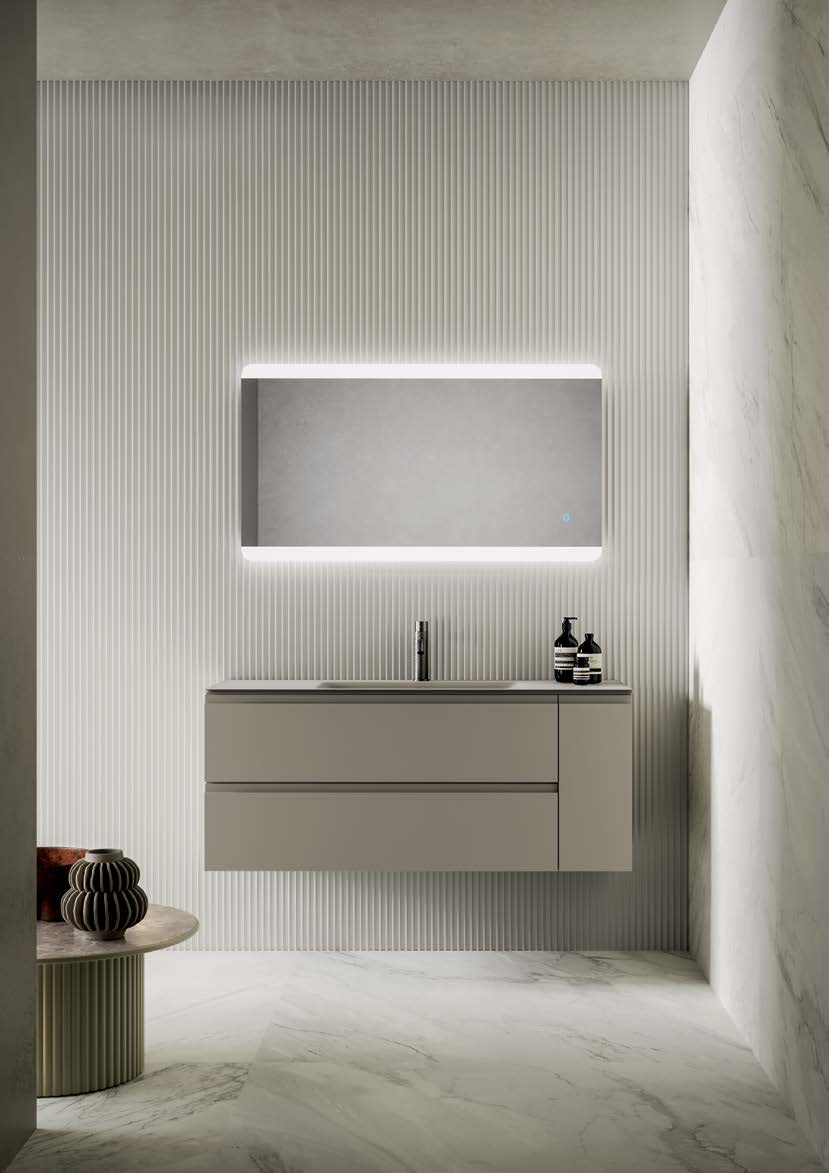 The integrated sink blends perfectly with the clean lines of the cabinet, while the matching mirror , with the option of LED lighting, adds a contemporary touch and enhances the brightness of the space.