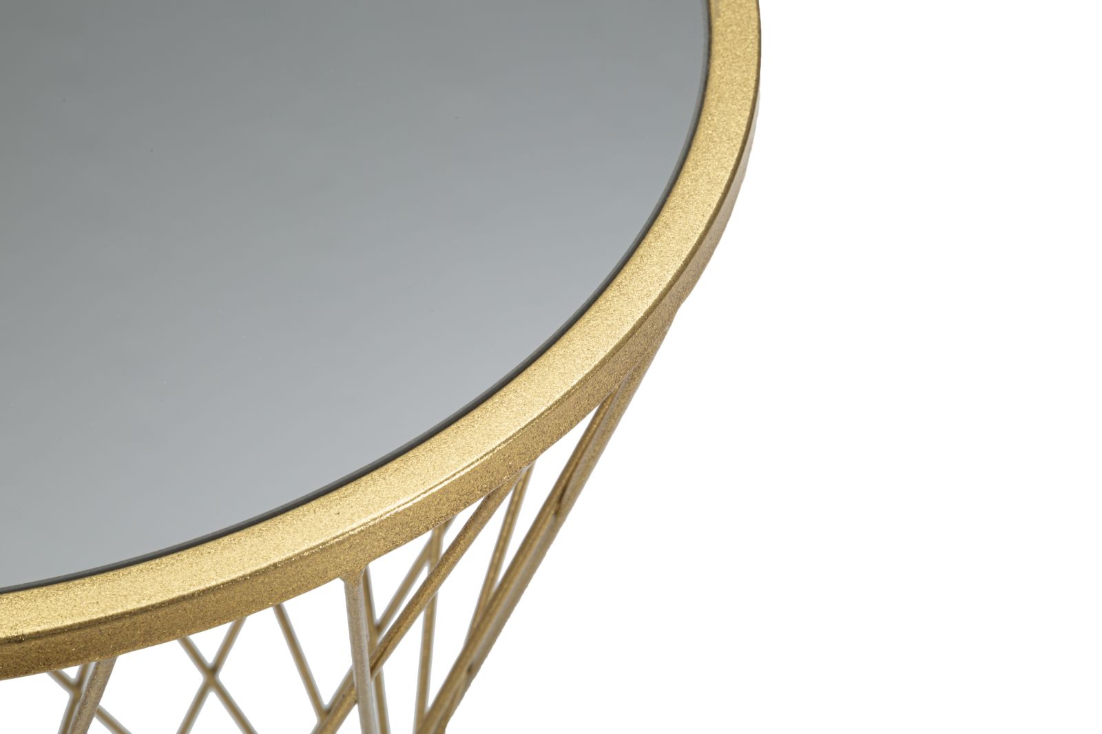 Round coffee table in golden metal with a simple structure and essential lines with a mirrored glass top.