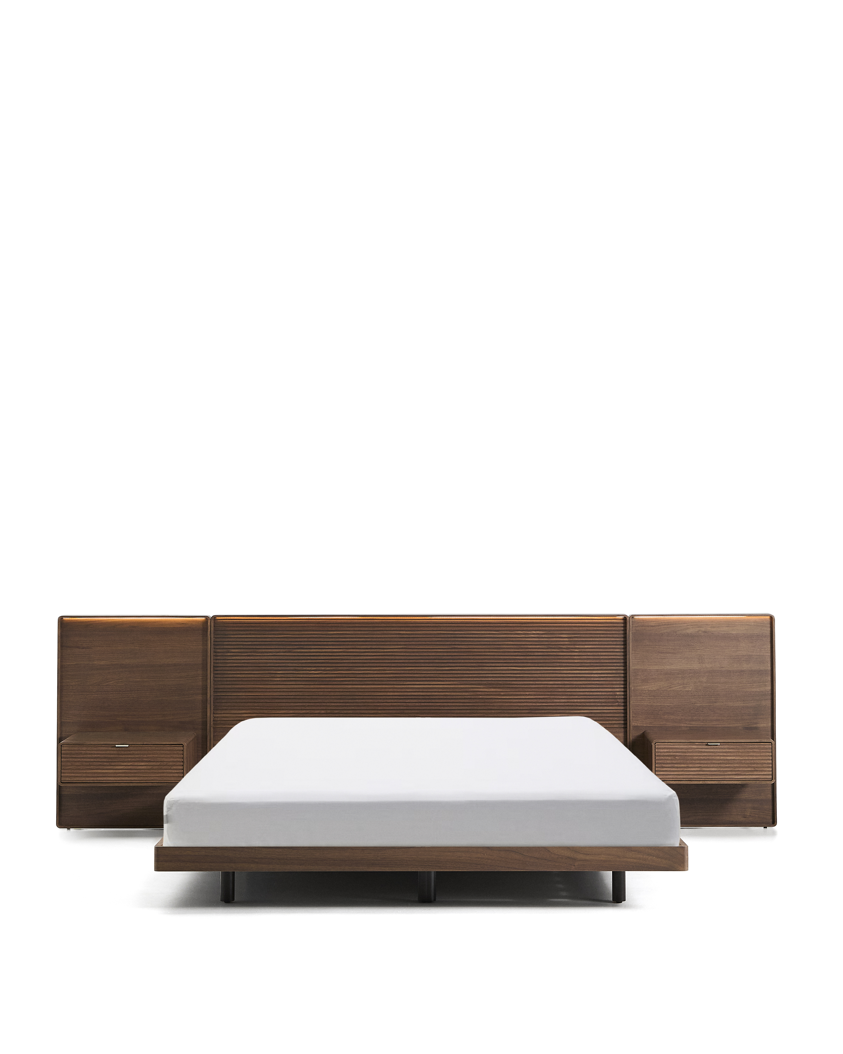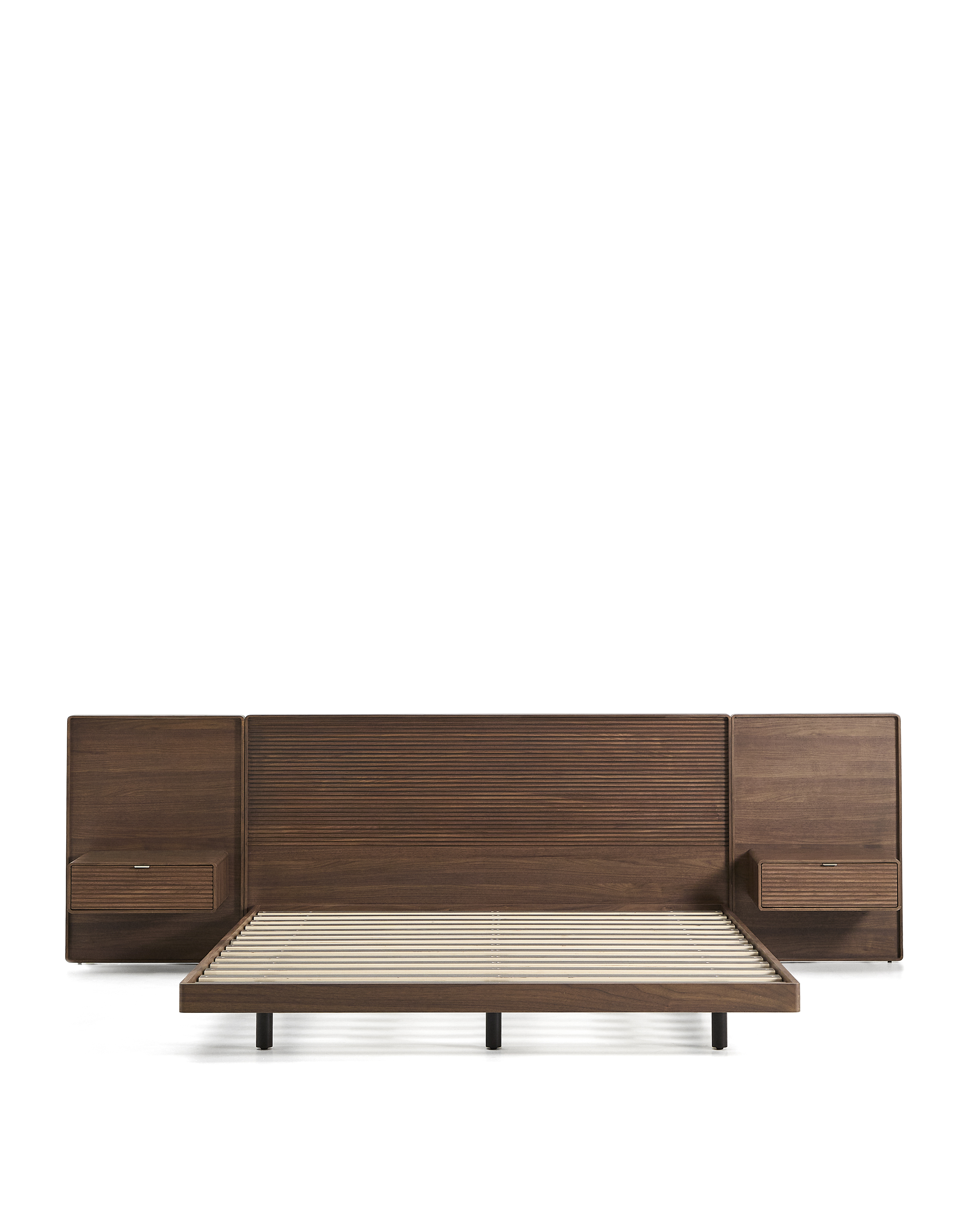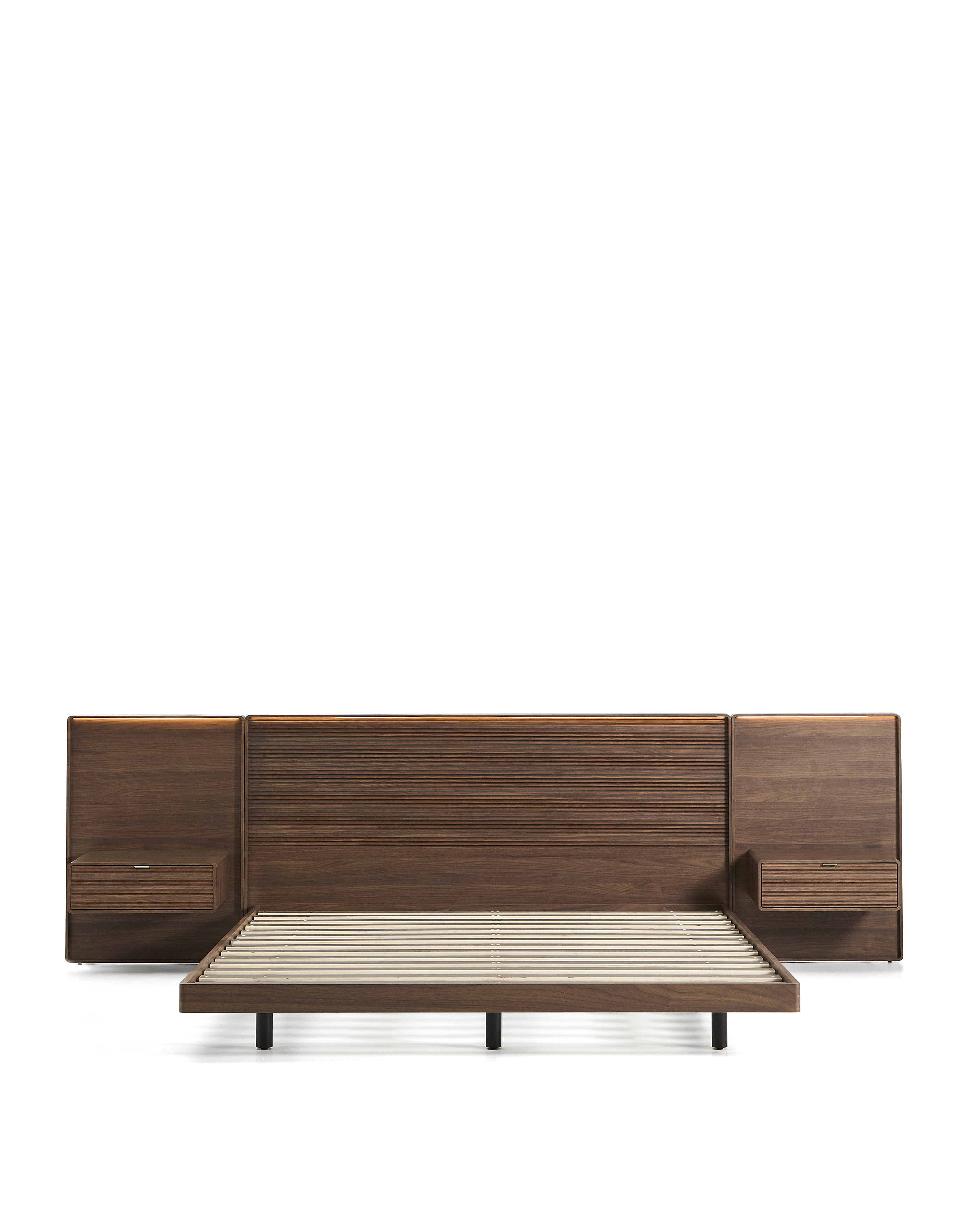 Norlen pays homage to 1950s design with a contemporary twist, blending minimalist forms and vintage details. The softly rounded corners and wooden base evoke a nostalgic feel, reinterpreted with pure lines and contemporary proportions. The walnut veneer headboard with delicate horizontal linear milling adds character and visual depth, while the integrated LED light strip at the top floods the room with 3000K lighting, a warm, pleasant light with a subtle yellowish hue, perfect for creating a cozy, welcoming atmosphere during rest. The light is activated by remote control. The 1.5-meter cord with direct plug-in power facilitates convenient and versatile installation in any space. The solid and sturdy bed base features a 14-slat birch plywood base, designed to offer perfect support and optimal ventilation for the mattress. Nine solid birch legs, with an elegant circular cross-section and a walnut-clad outer profile, ensure maximum stability and aesthetic continuity in the design, blending beauty and functionality in every detail. The set is completed by two perfectly integrated bedside tables, which also incorporate LED lighting to create a uniform and enveloping ambiance throughout the bedroom. Each bedside table offers practical storage solutions with a drawer featuring concealed slides with soft-close function, ensuring smooth and silent opening and closing. The handles are brushed stainless steel with a satin finish, which reduces the visibility of fingerprints and scratches and is highly resistant to corrosion. Furthermore, the slanted design makes it easier to grip when opening the door. FSC Mix Credit certified wood, made with a mix of materials from FSC-certified forests and FSC-controlled wood. This proposal is the ideal choice for those seeking the perfect balance of sophisticated design, technical innovation, and maximum comfort in the bedroom.