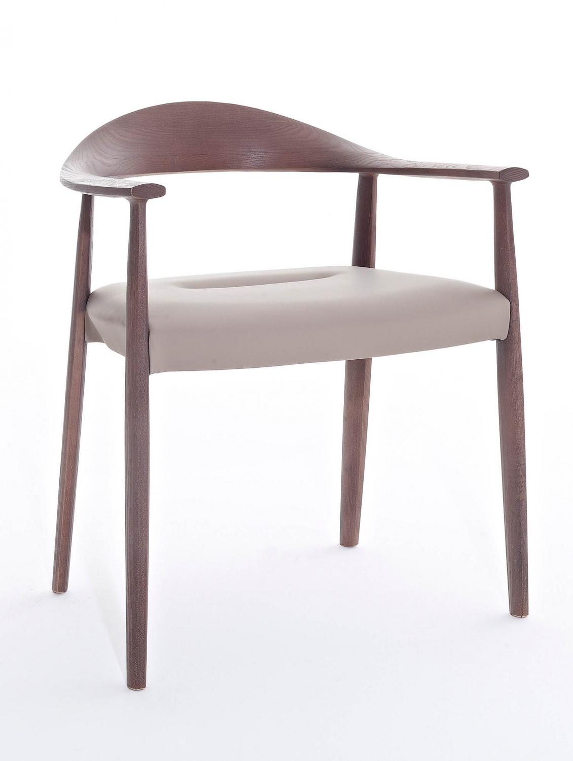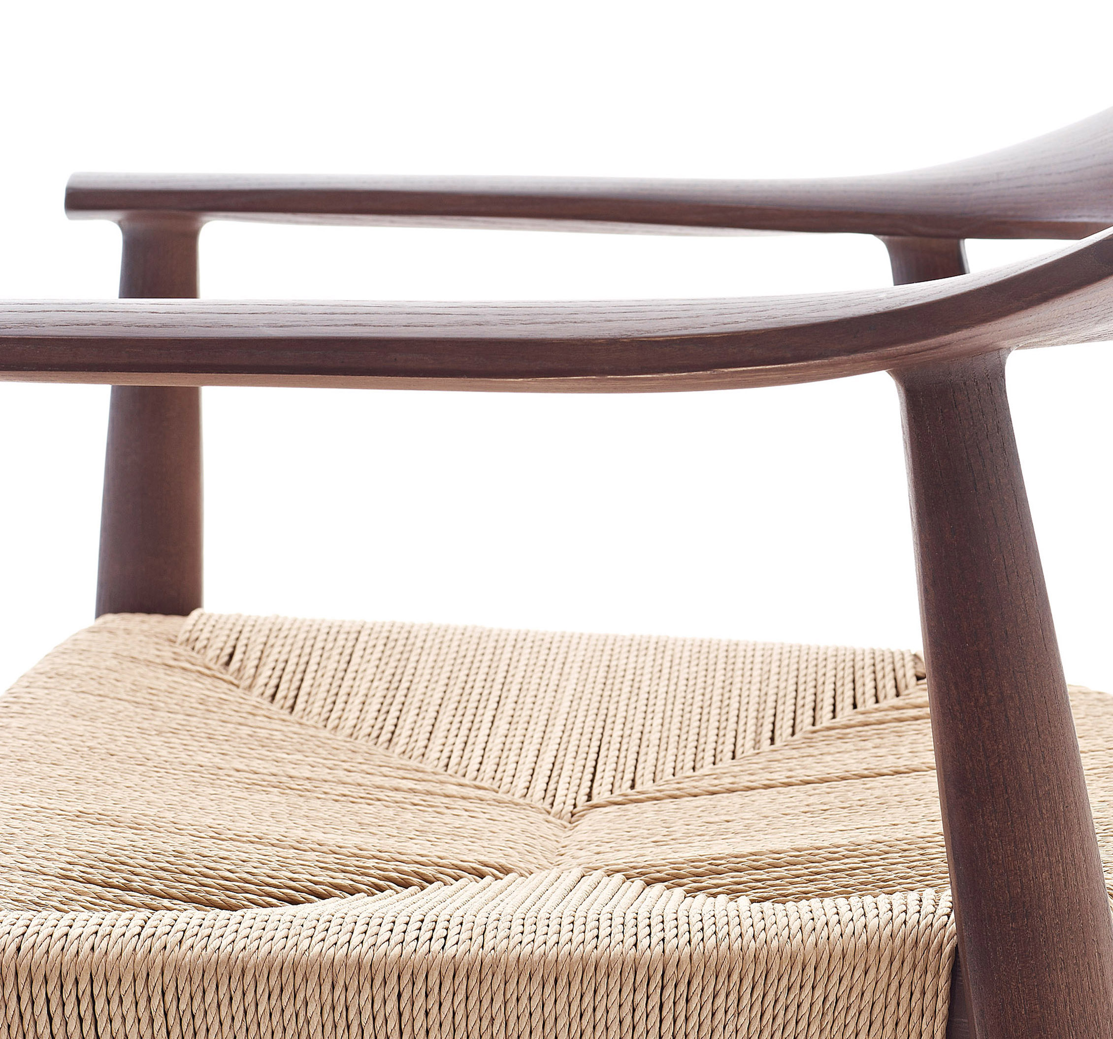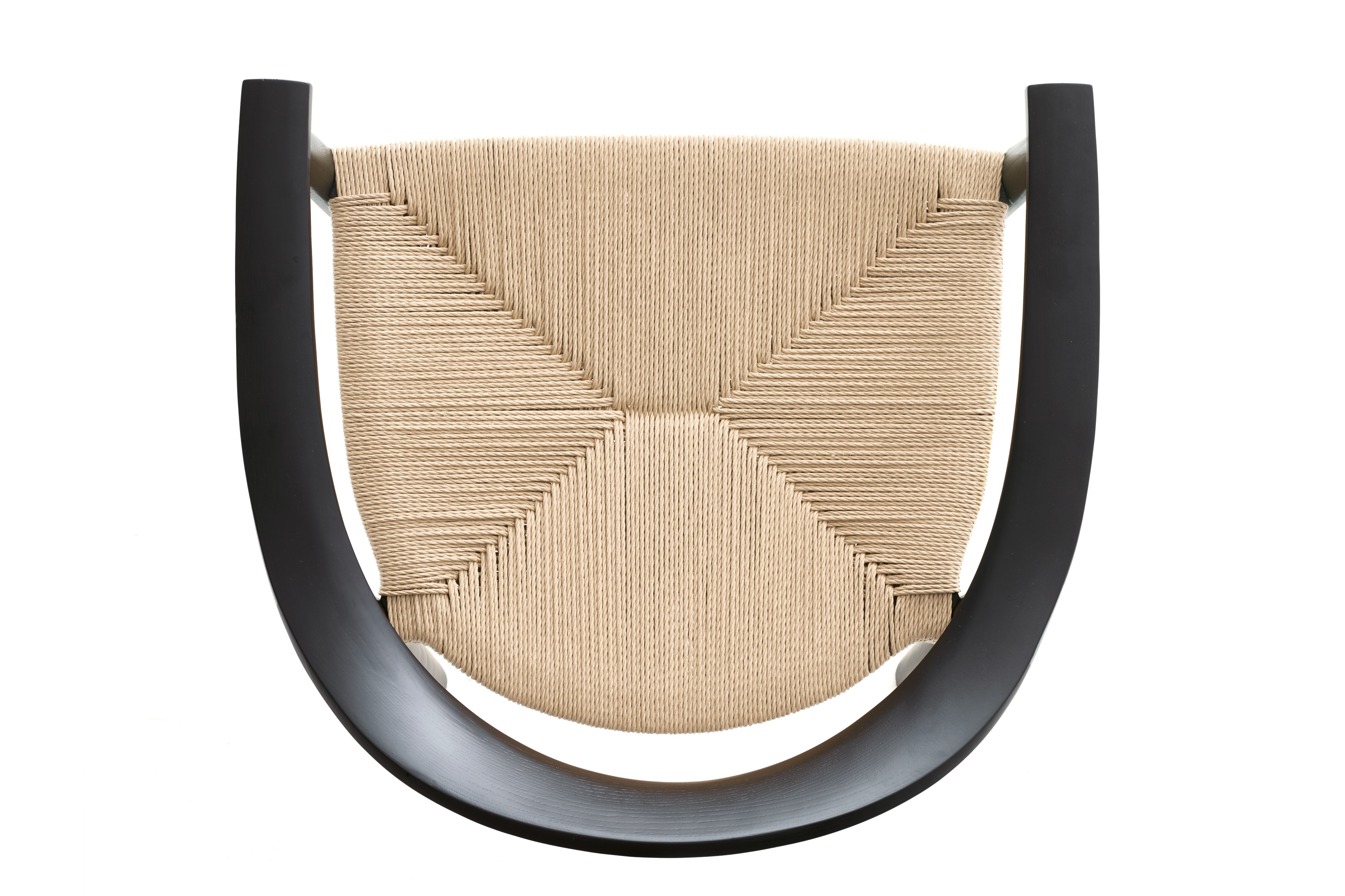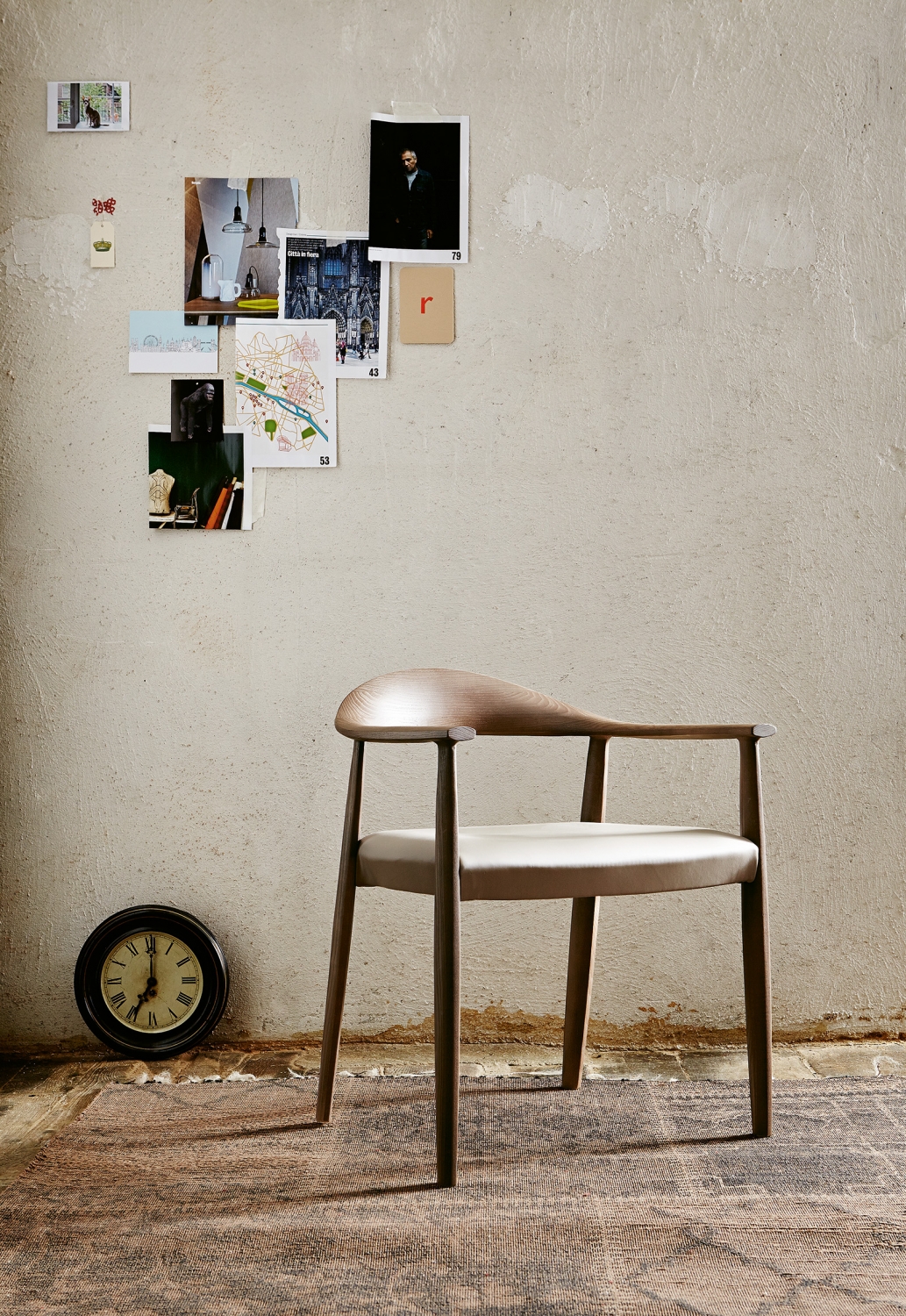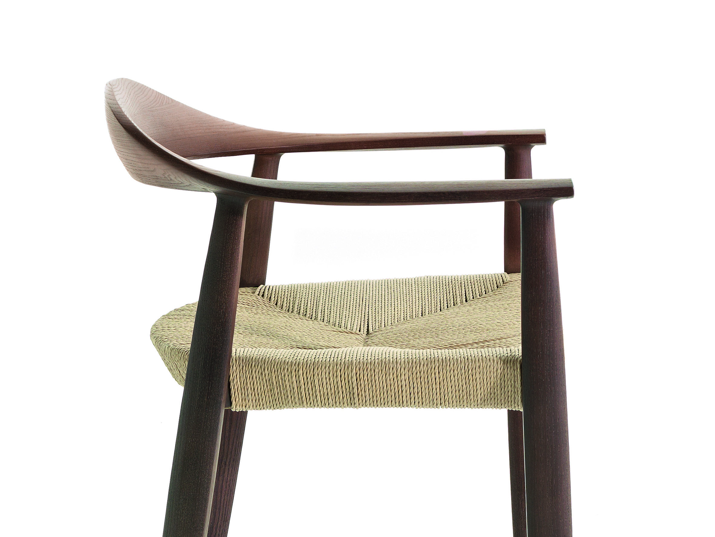 Chair with ash wood structure and seat made of hand-woven straw or covered in fabric or leather.